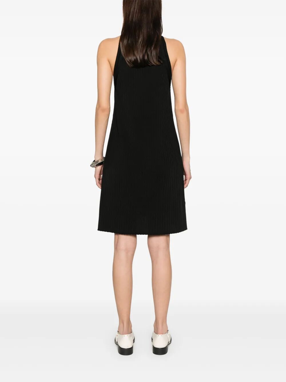 This black knitted mini dress has a crew neck and sleeveless design, with ribbed panelling for a flattering silhouette. Perfect for those looking to make a stylish statement while staying comfortable.