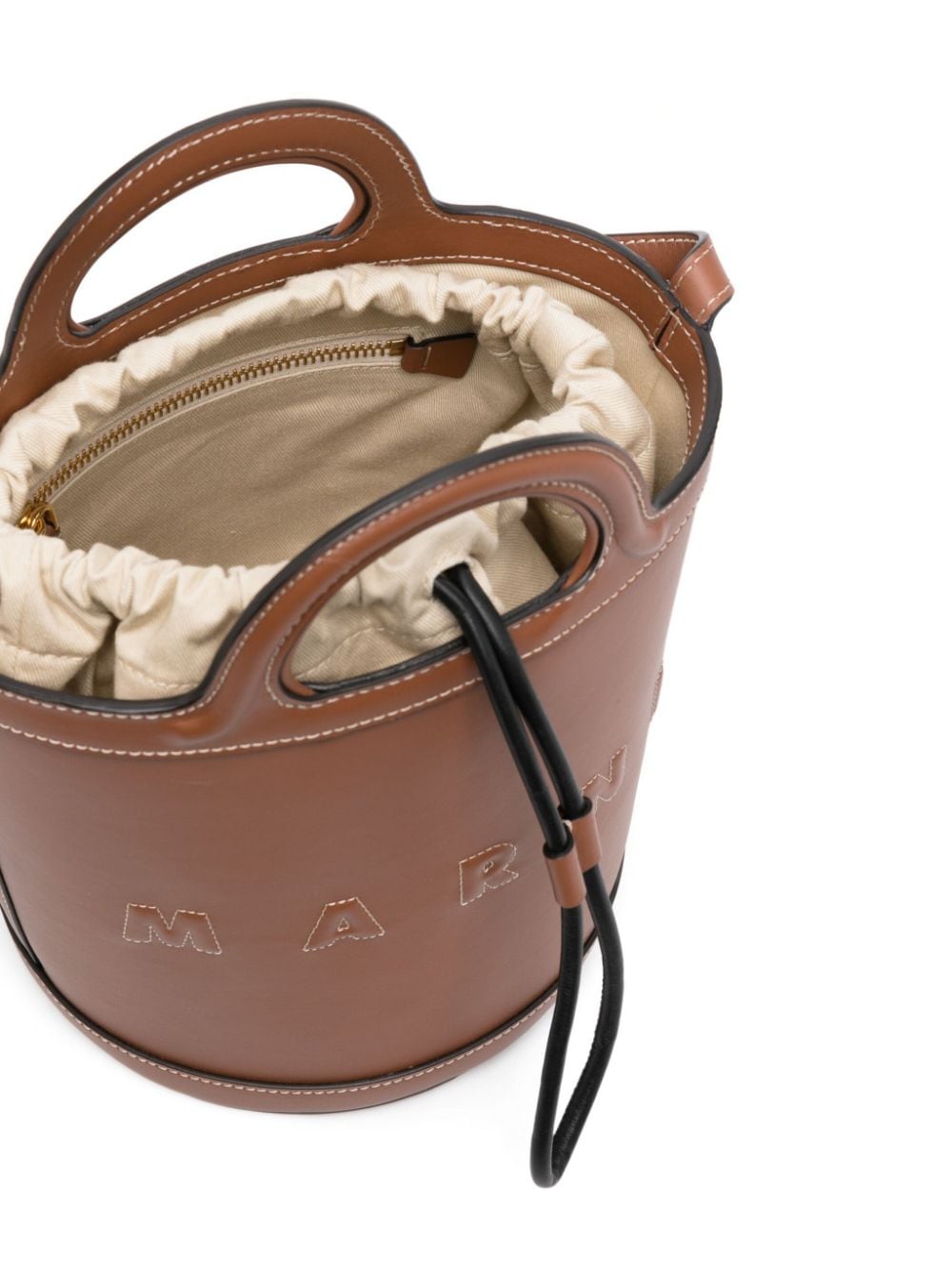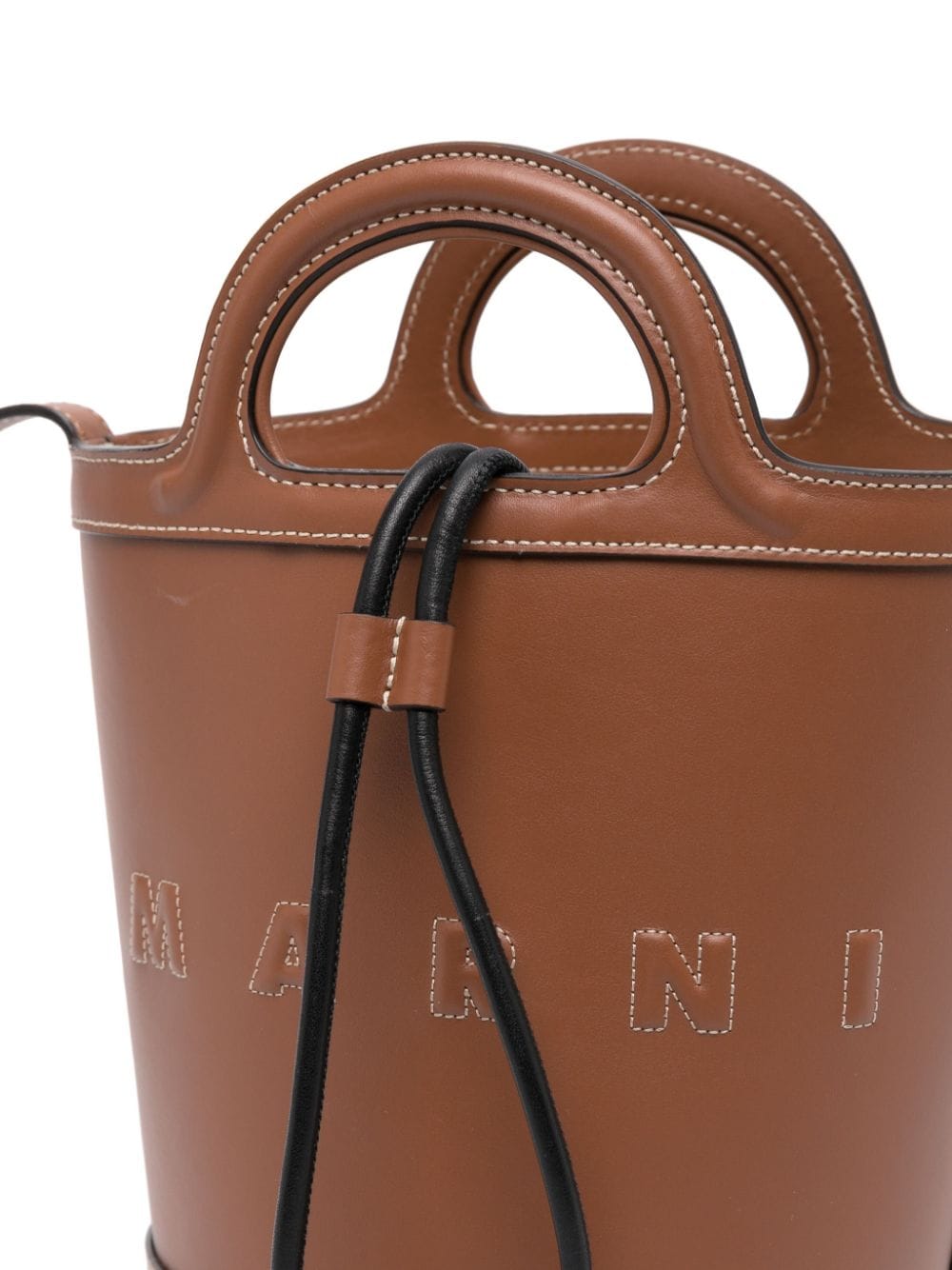 Introducing the camel MINI BUCKET, the perfect combination of style and functionality. Made of high-quality black leather, this bag features two handles and an adjustable shoulder strap for versatile wear. With a convenient internal drawstring and an embroidered logo, it's the ultimate accessory for any outfit.