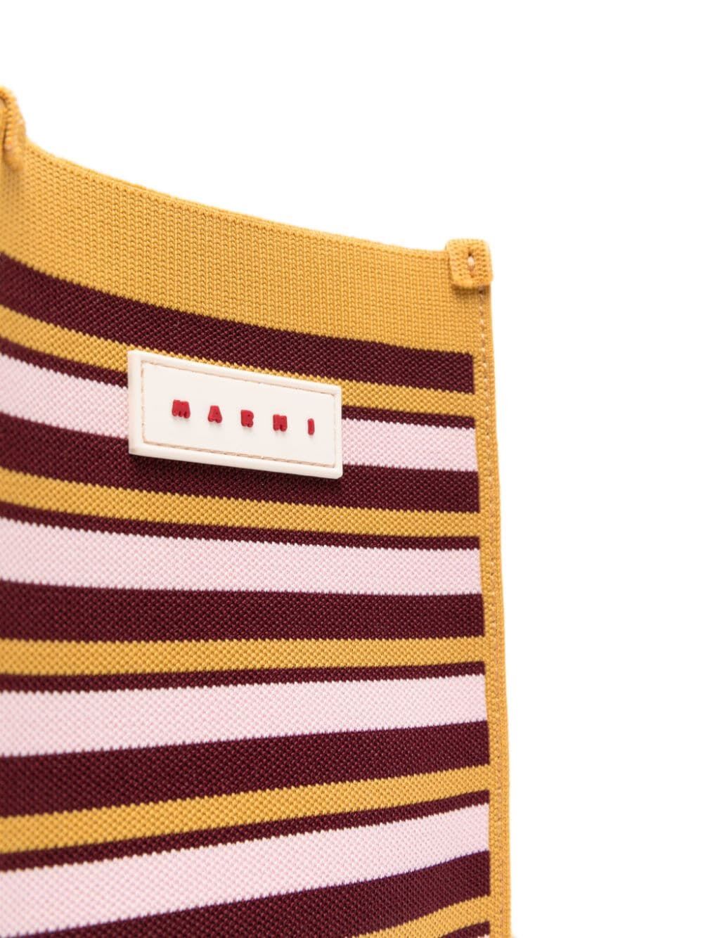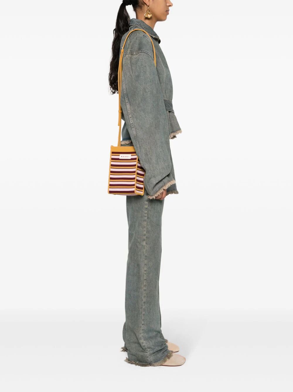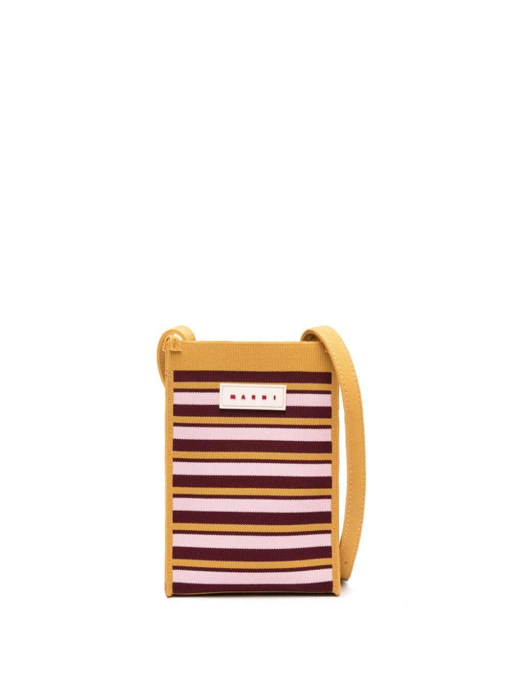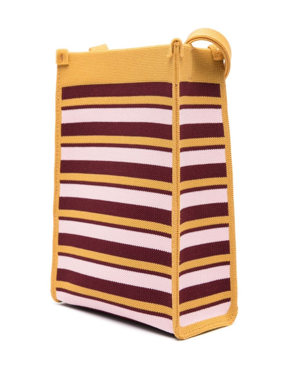 This compact cross body bag adds a pop of color with its vibrant orange, burgundy, and pink piqué weave and horizontal stripe pattern. The adjustable shoulder strap and open top make it versatile and easy to access, while the hard rectangle body and appliqué logo give it a playful edge.