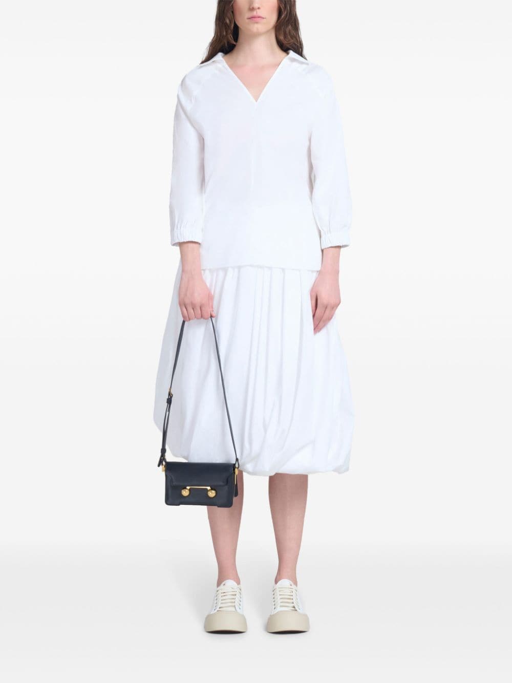 Add some fun to your everyday look with the black MINI TRUNKAROO SHOULDER BAG. Made from high-quality calf leather, this rectangular bag features an oversized magnetic closure with the iconic Marni logo and metal spheres for a statement look. With an adjustable and detachable buckle strap, the bag can also be worn as a clutch. Made in Italy with eco-friendly leather.