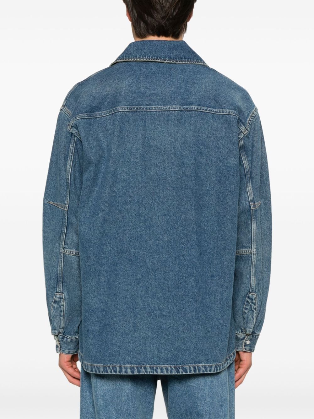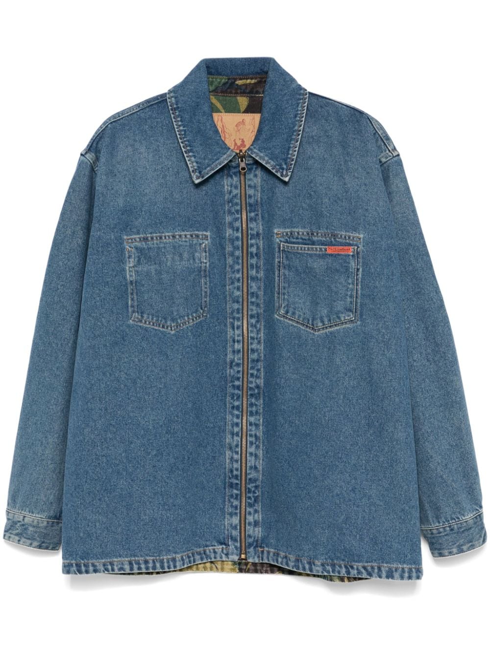Get two looks in one with this playful REVERSIBLE CAMO SHIRT. Side A features a classic blue denim with a front zip fastening and a chest patch pocket, while Side B boasts a bold green and brown camo print with two chest flap pockets. Made with cotton for comfort and style.