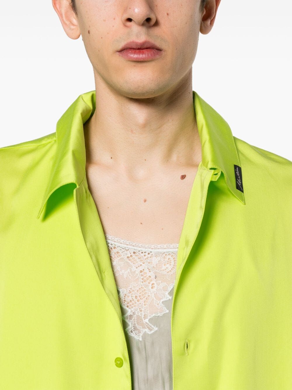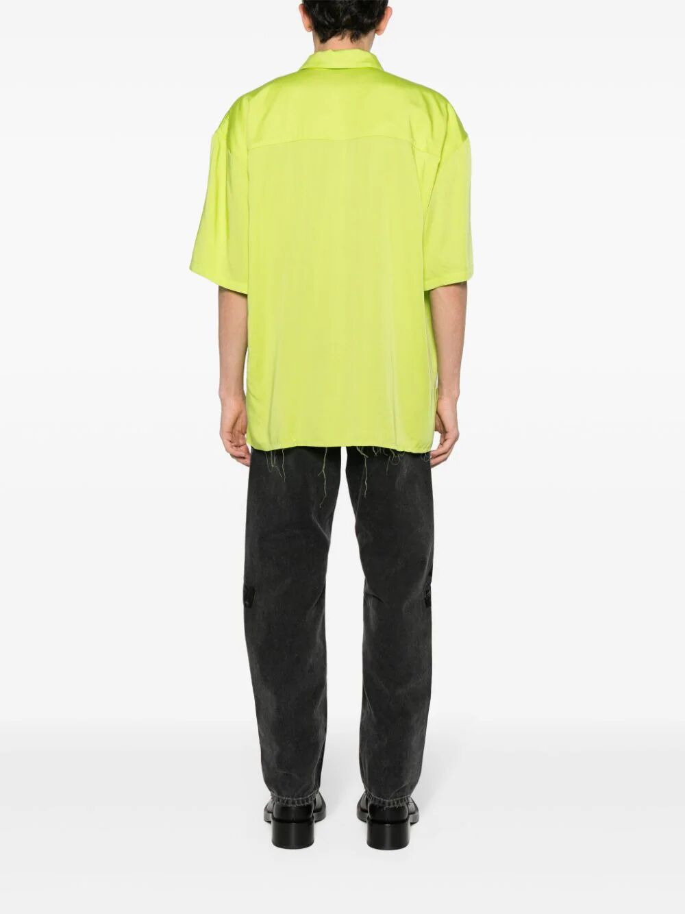 Our lime green short-sleeve shirt adds a pop of color to any outfit. The satin finish gives it a luxurious feel, while the pointed flat collar and mini logo tag add a touch of style. With side slits, a high-low hem, and a front button fastening, this shirt is both comfortable and fashionable.