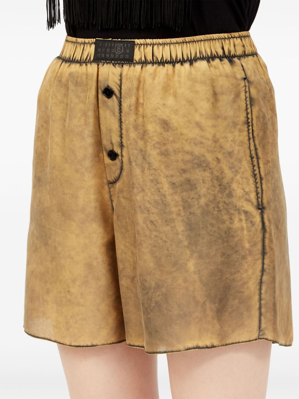 These beige silk shorts feature a playful distressed finish and a comfortable elasticated waistband with a front button fastening. Complete with a rear jetted pocket, these thigh-length shorts are perfect for adding a quirky touch to any outfit.