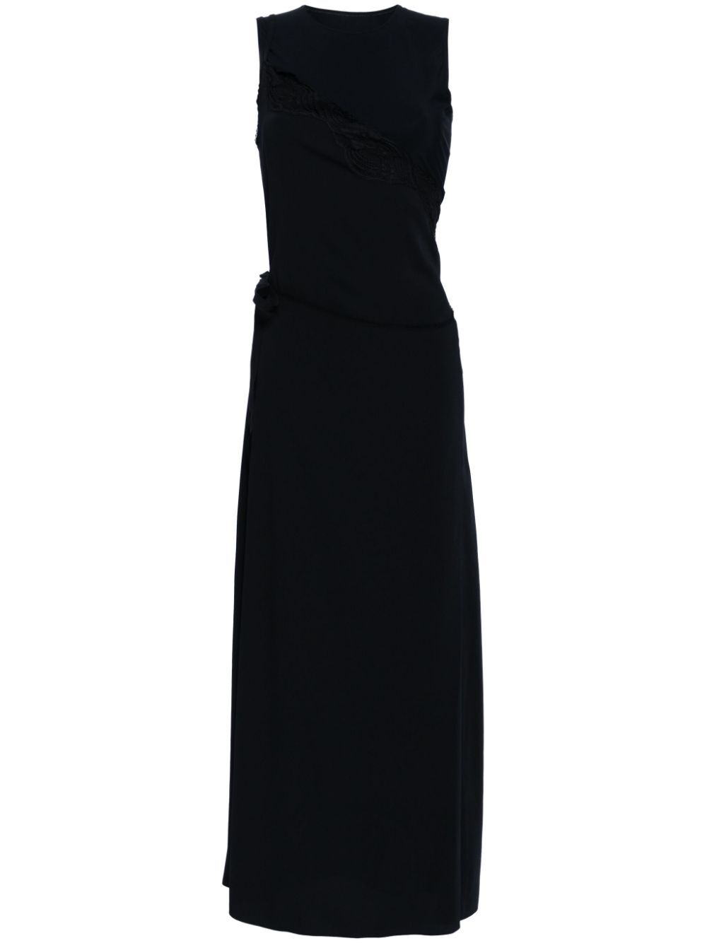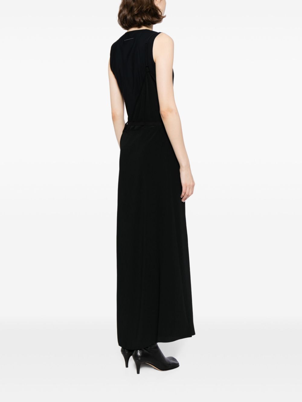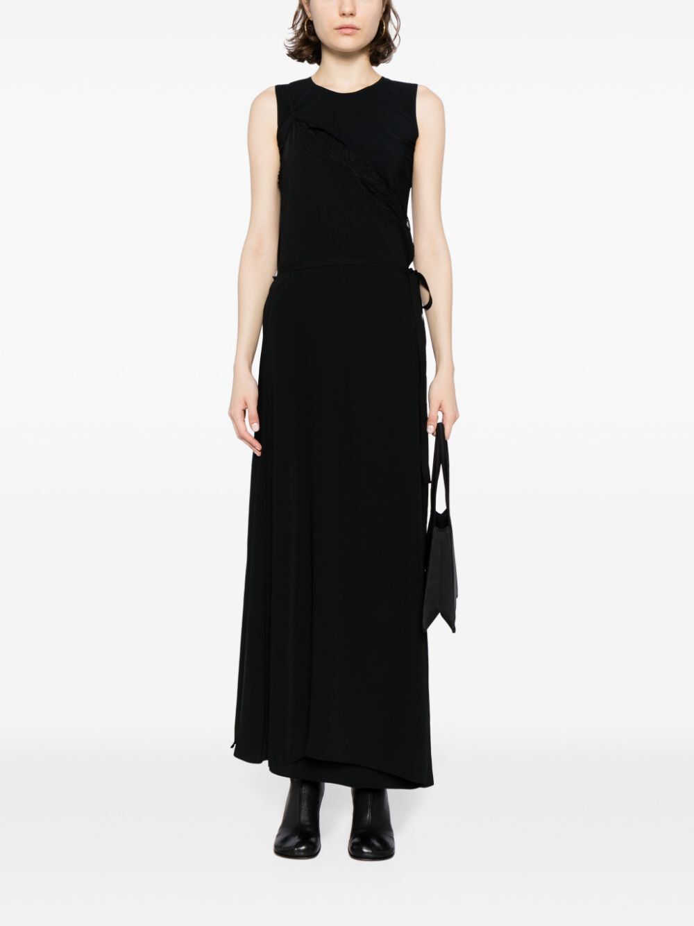 Elevate your style with this playful black maxi dress. With gorgeous lace and draped detailing, you'll feel effortlessly chic. Plus, the detachable panel allows for versatile looks that can be dressed up or down. Perfect for any occasion with its round neck, sleeveless design, and straight hem. Get ready to make a statement in this long length dress.