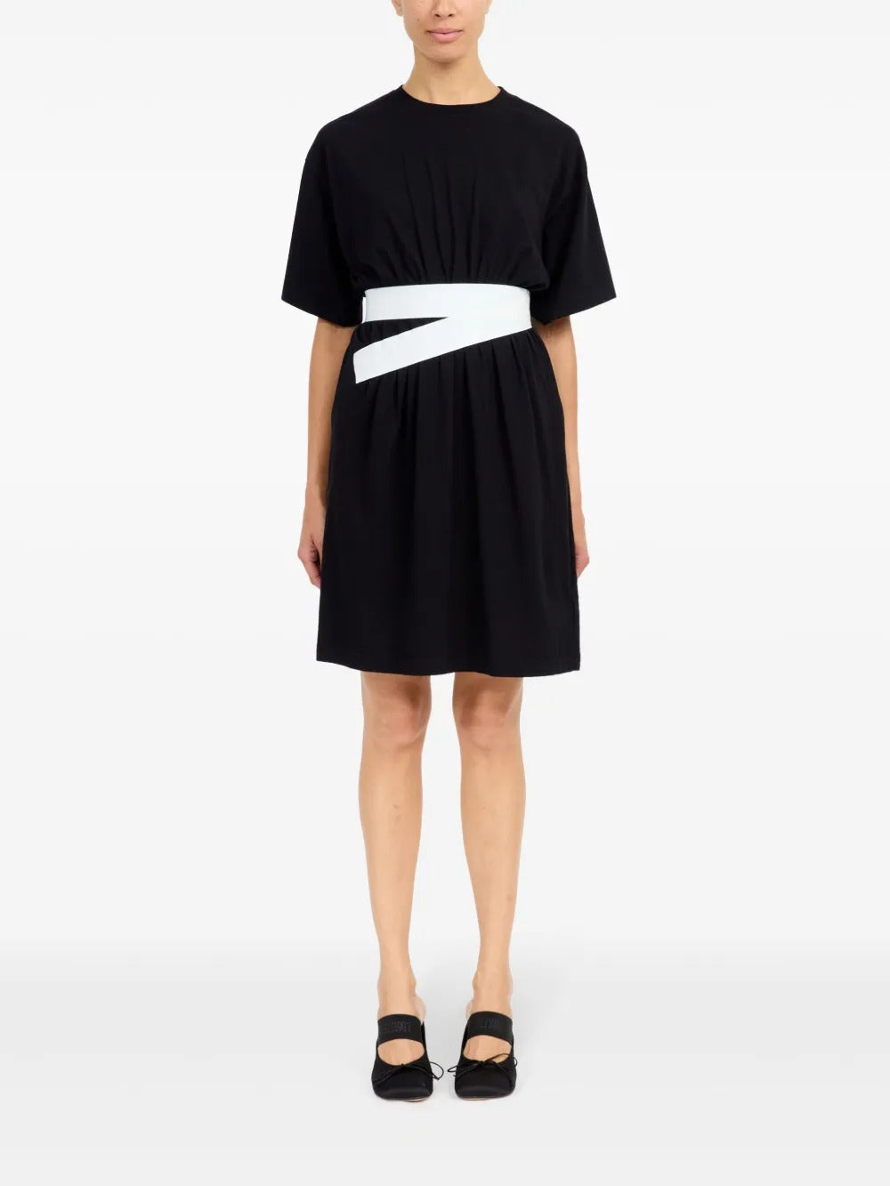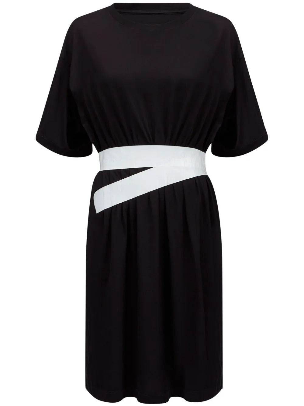 Step out in style with this versatile Mini Dress! Made with a soft and breathable cotton fabric, this dress features a flattering crew neck, short sleeves, and a unique contrasting waist belt. With a straight hem and a length above the knee, this black dress is perfect for any occasion.