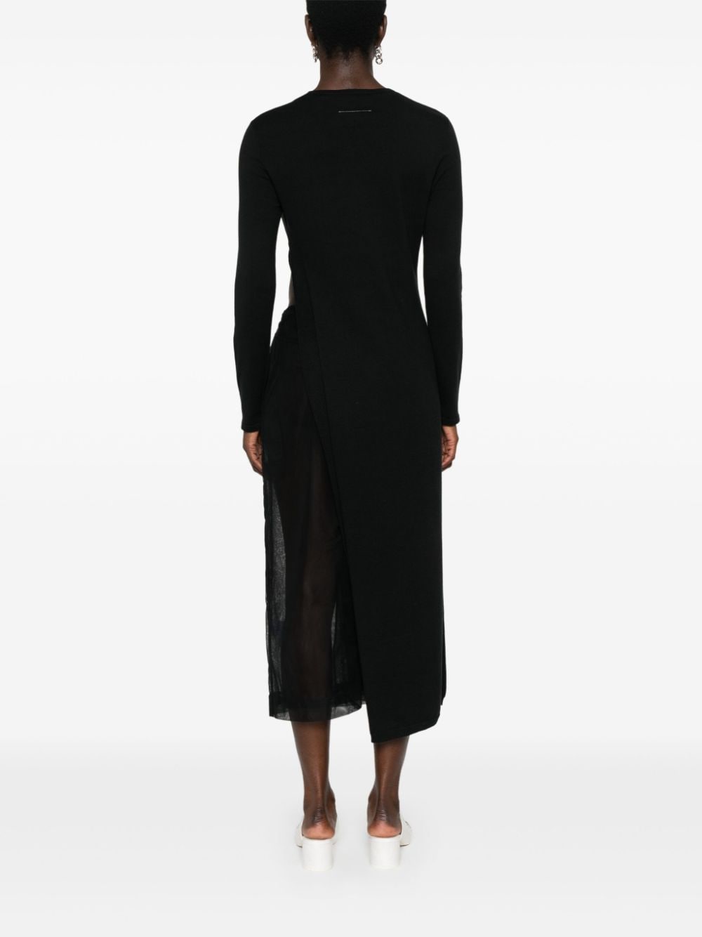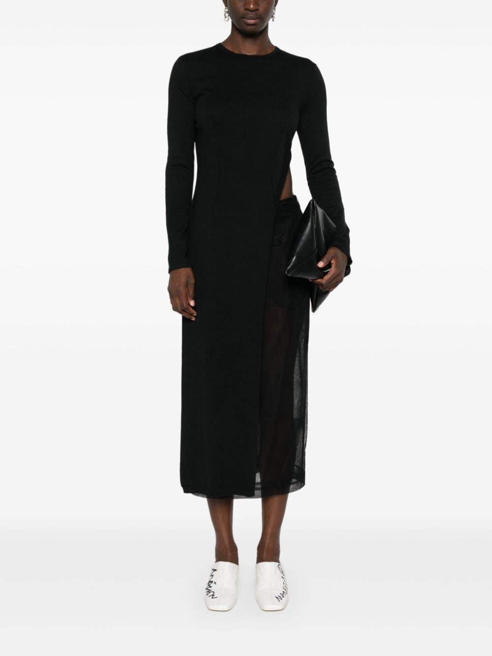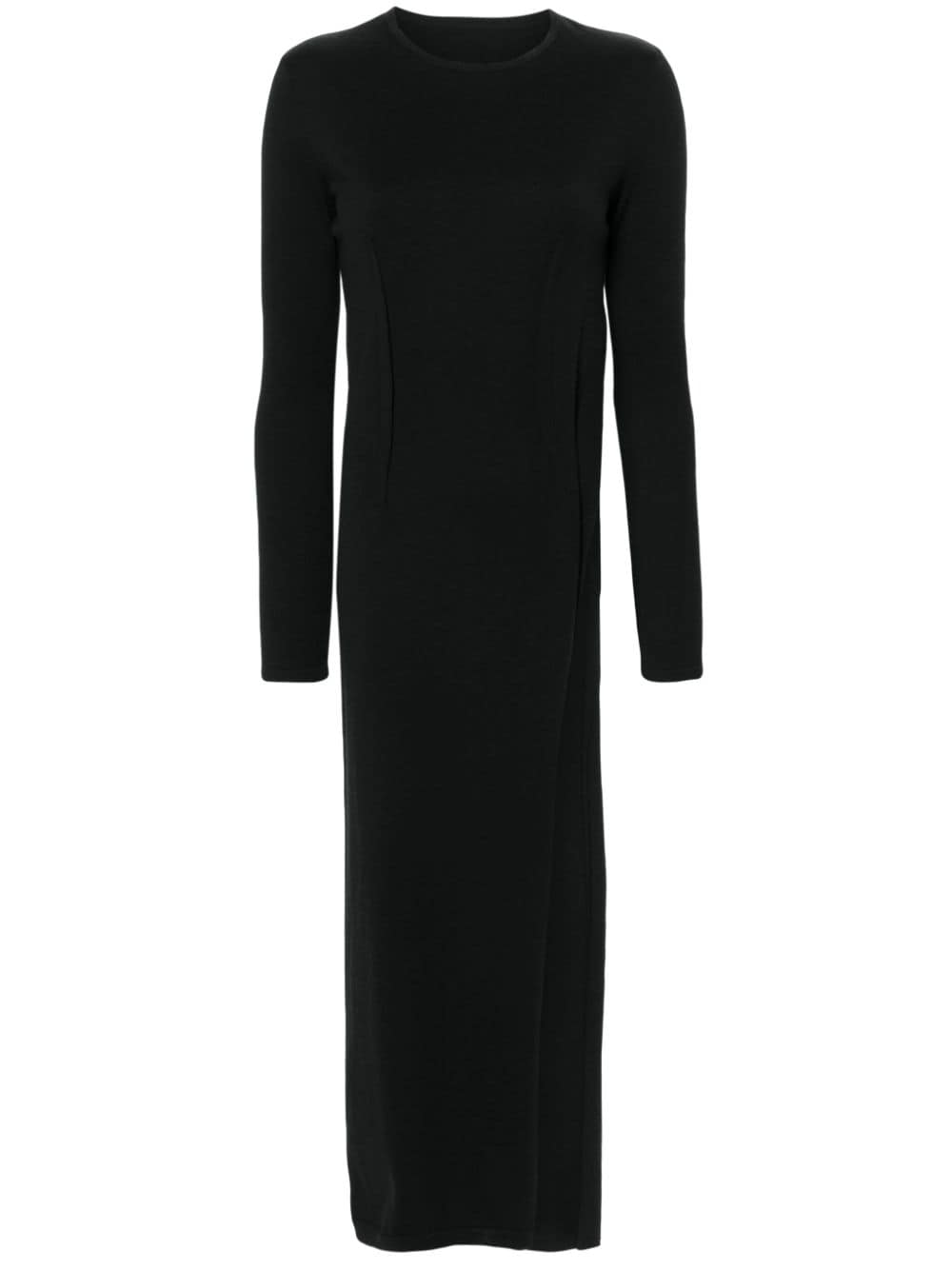 Add some edge to your wardrobe with our Side Cut Midi Dress. This black dress is made from a comfortable cotton-wool blend and features a unique knitted construction. The signature single-stitch logo adds a subtle touch, while the pleat detailing and side slit add dimension to this classic round neck, long sleeve dress. Perfect for any occasion, this dress is a must-have for your collection.
