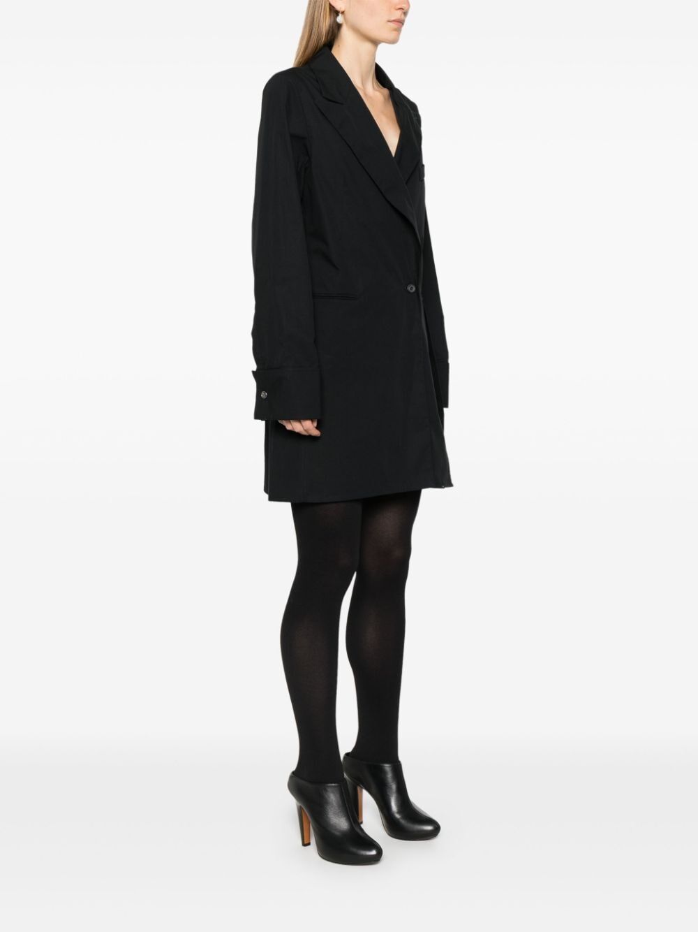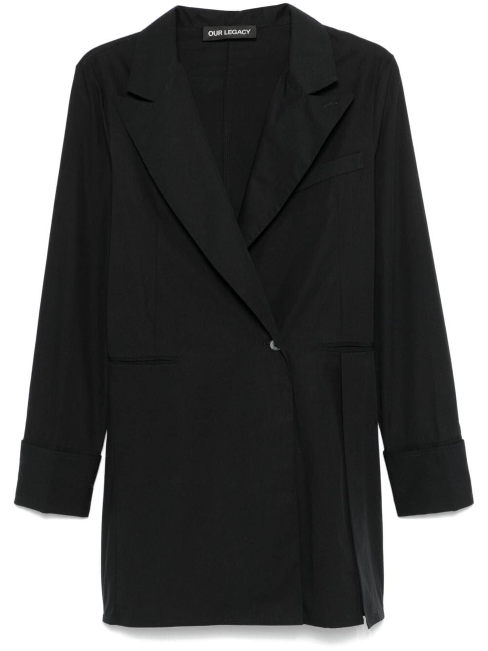Add a touch of sophistication to your style with our BLAZER SHIRT. Made with black cotton and a poplin texture, this double-breasted button fastening piece features peak lapels and long sleeves with French cuffs. Adorned with mother-of-pearl buttons, it also boasts a chest welt pocket and two front jetted pockets with pleat detailing. Perfect for any occasion, this above-knee length shirt is sure to elevate your wardrobe.