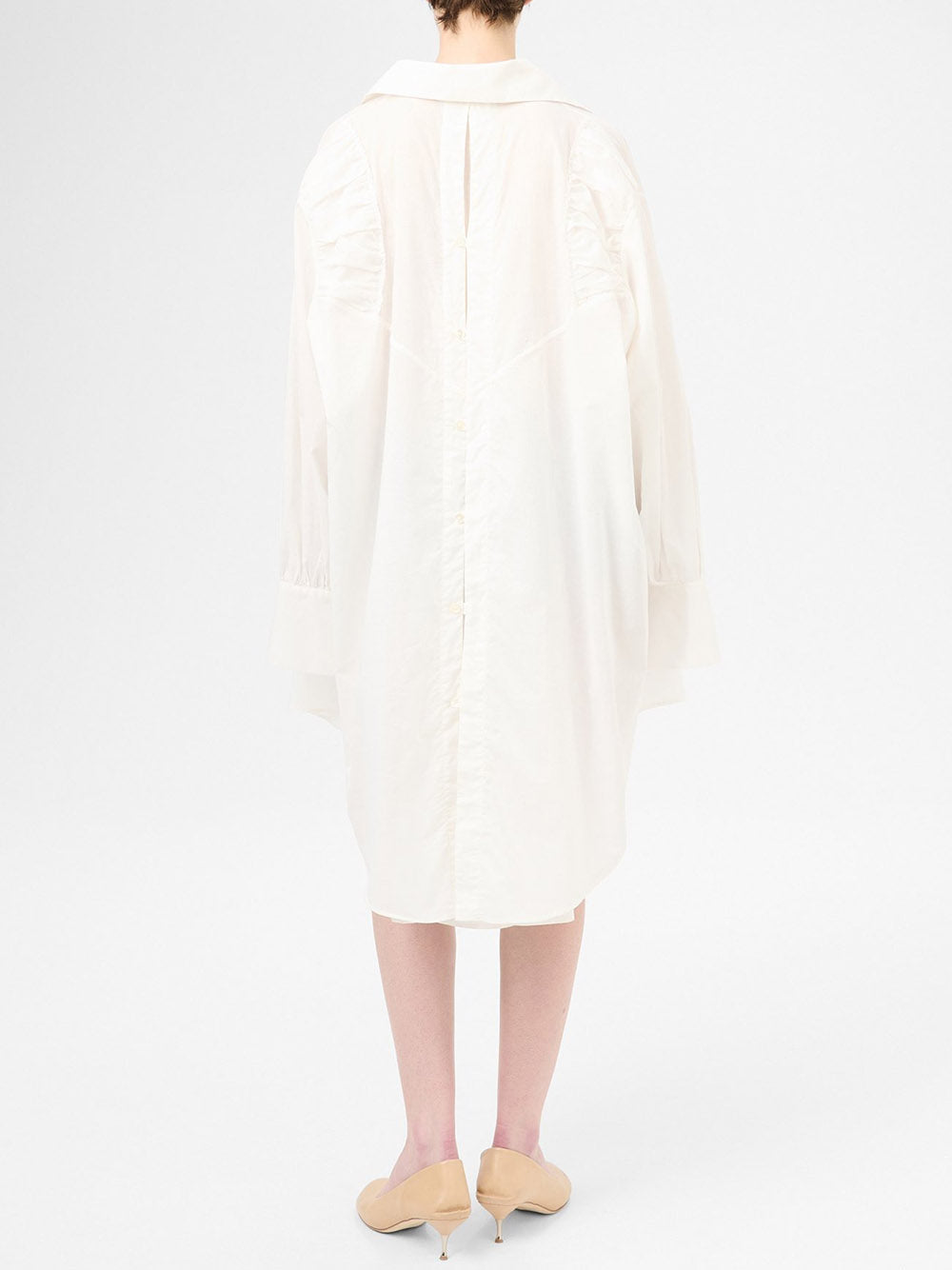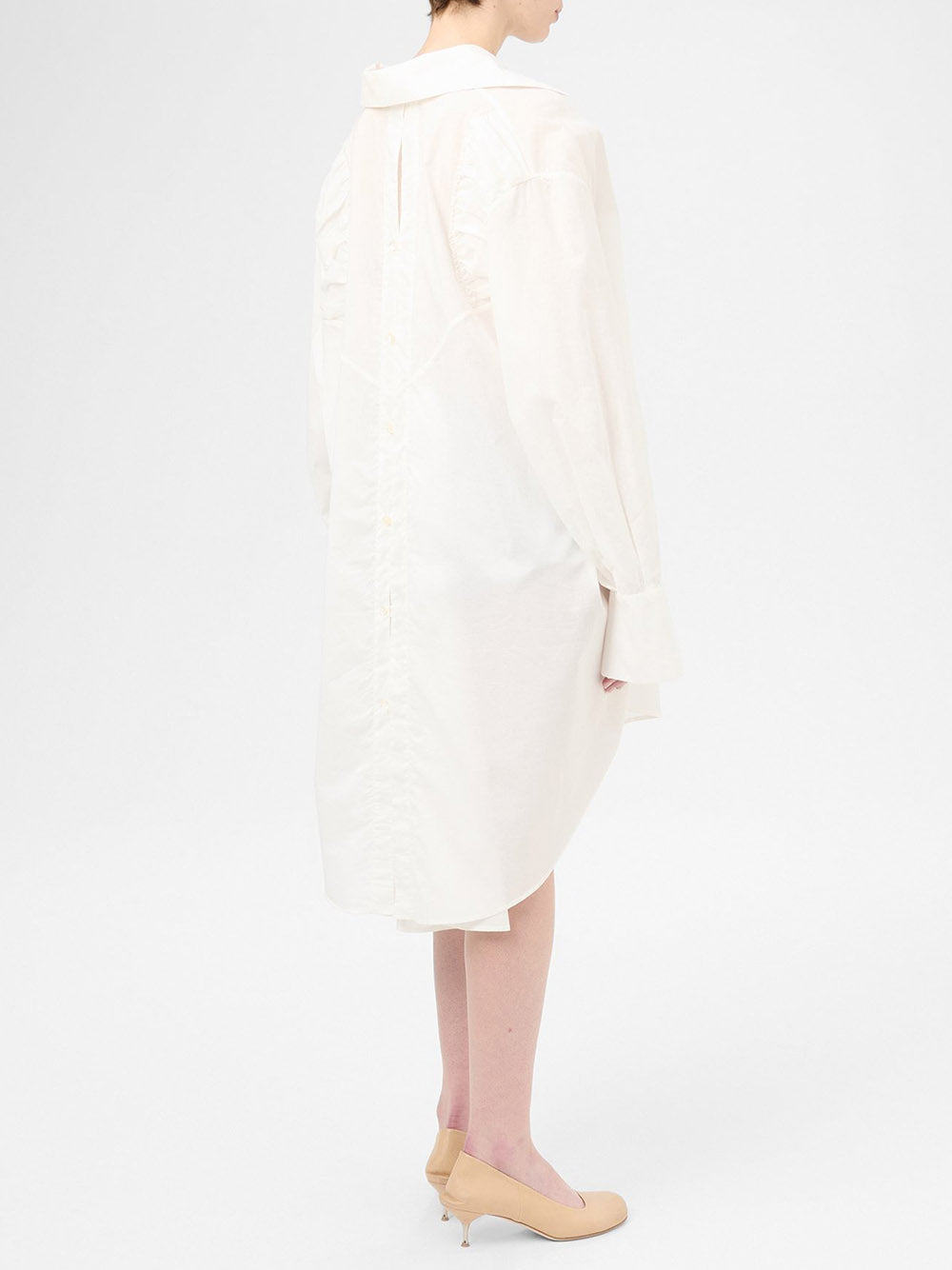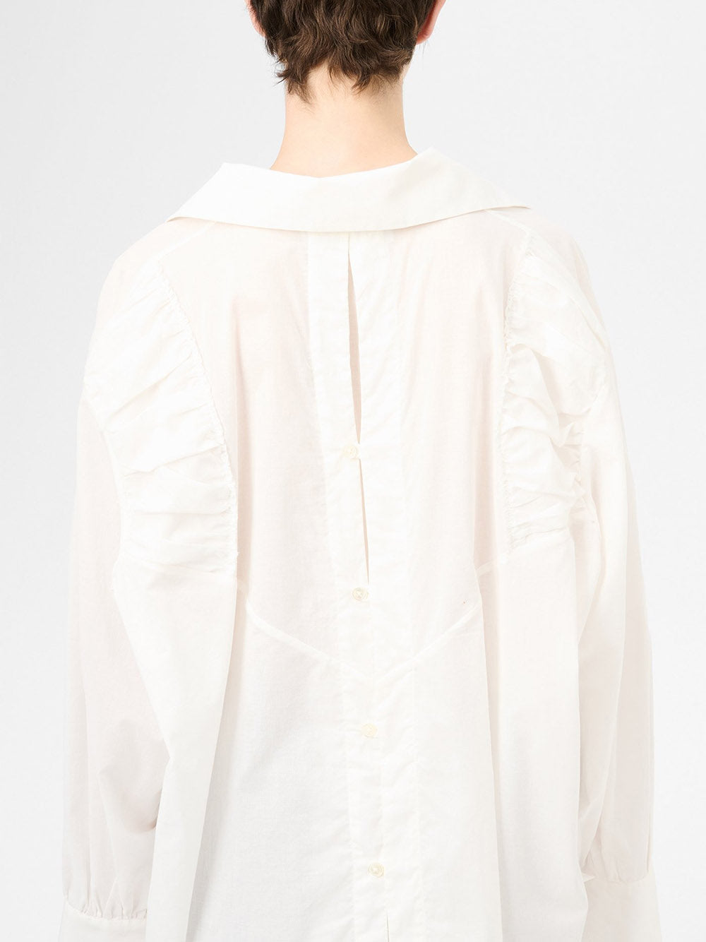 Introducing the GALE DRESS: a beautifully crafted, light weight voile dress with a gathered neckline and mother of pearl buttons. The deep vented cuffs and gathered panels on the back create a flattering silhouette, while the long gusseted back vent with button closure adds a unique touch. With a generous, relaxed fit, this dress is perfect for any occasion.