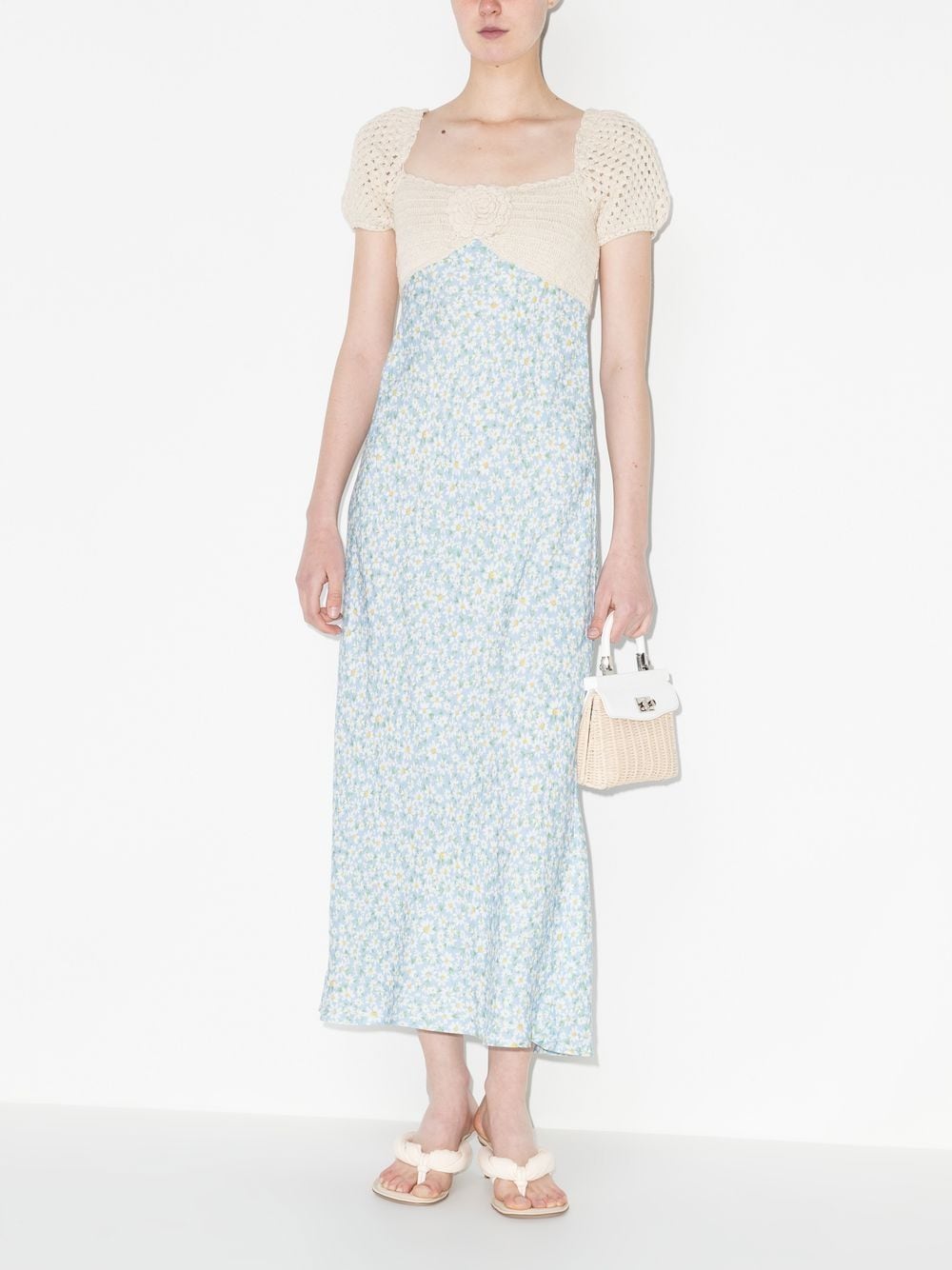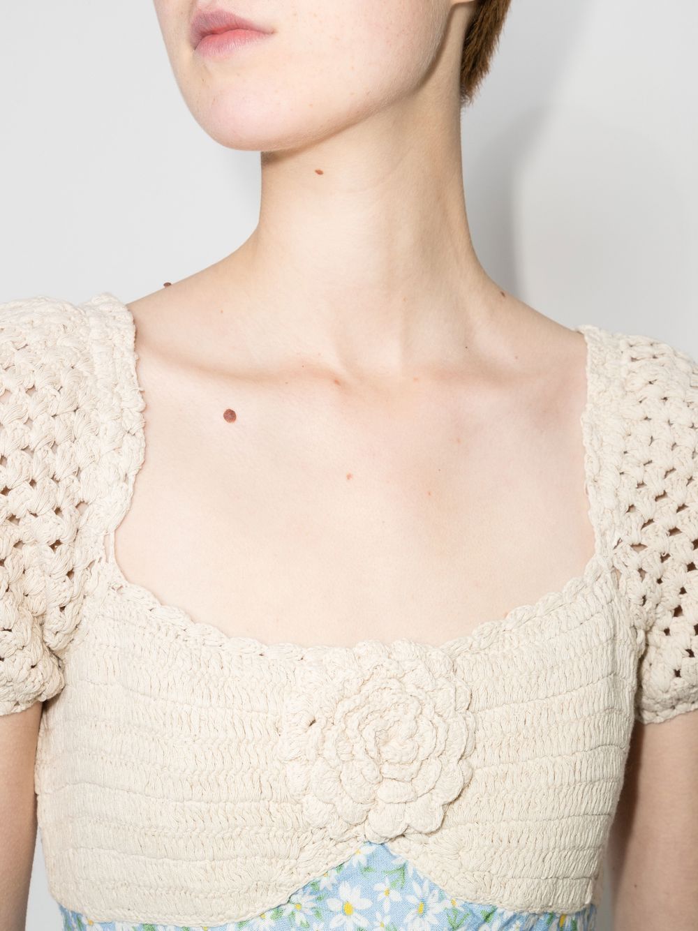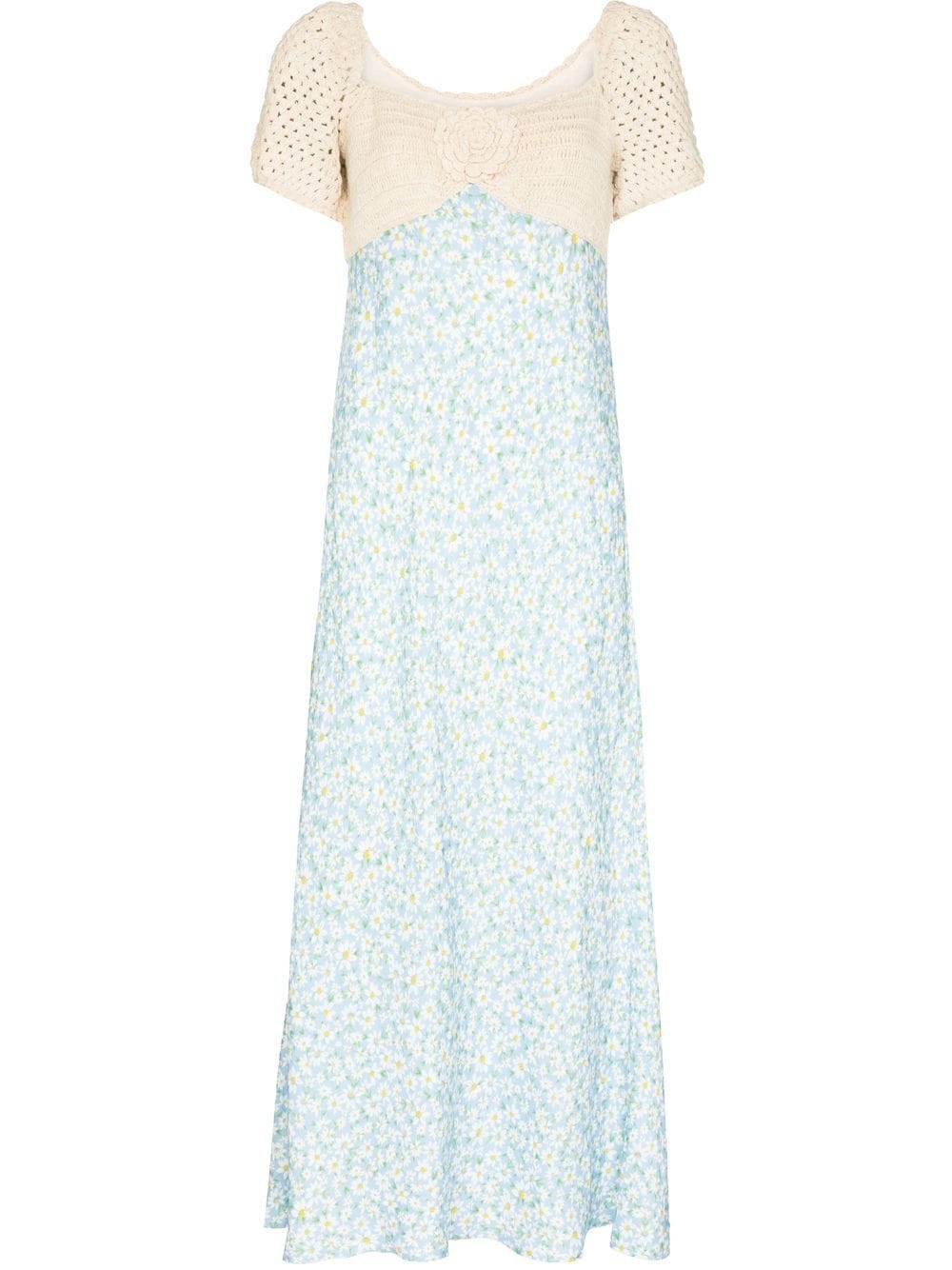 Step into spring with the playful Sardinia dress. Crafted with a slim-fit linen construction, this vintage-inspired midi dress boasts a hand-stitched crochet bust and sweet puff sleeves. The rose corsage and daisy print add a touch of whimsy.