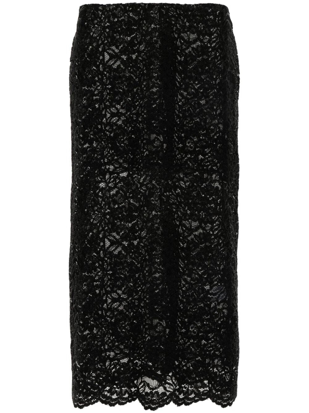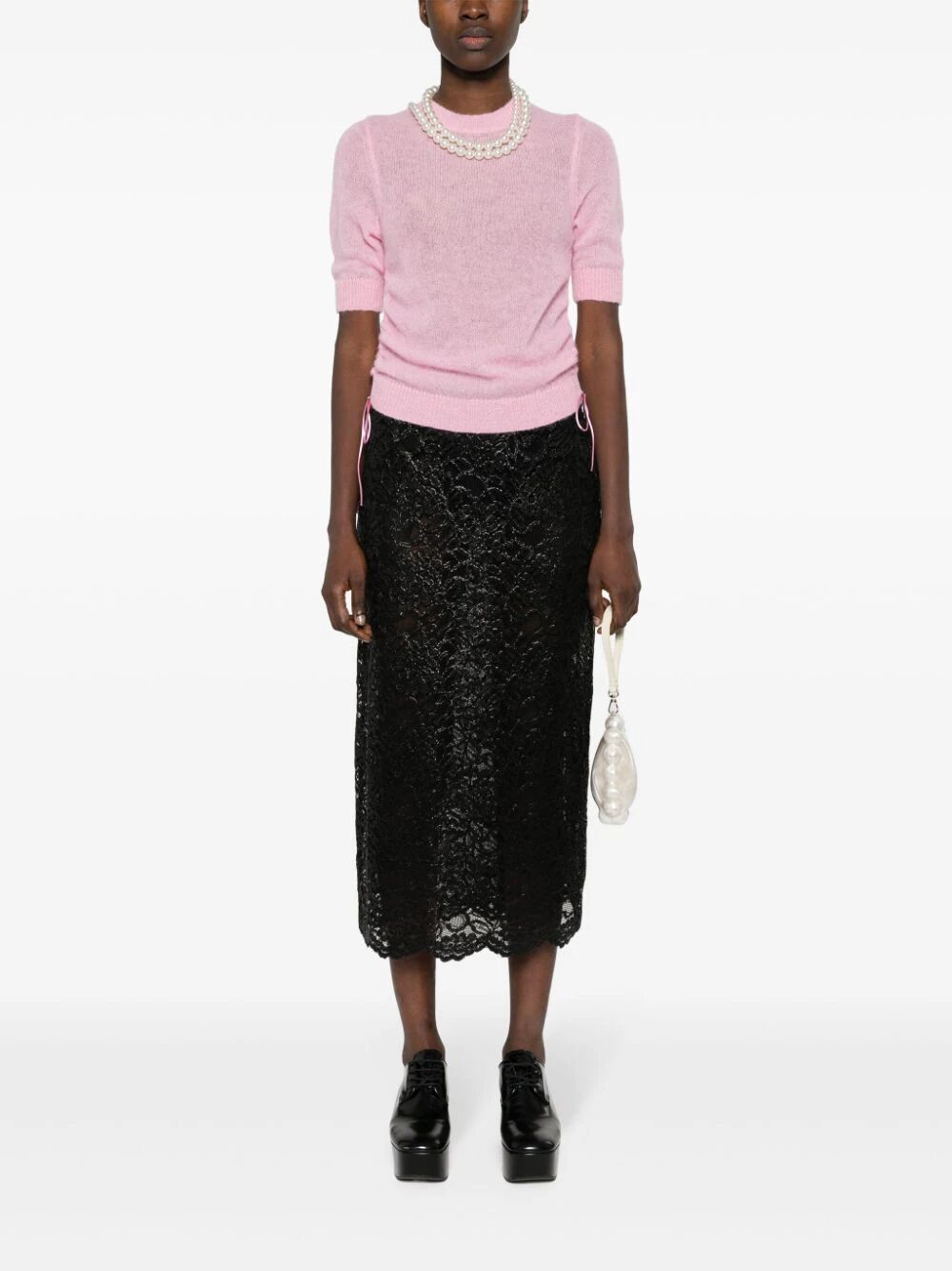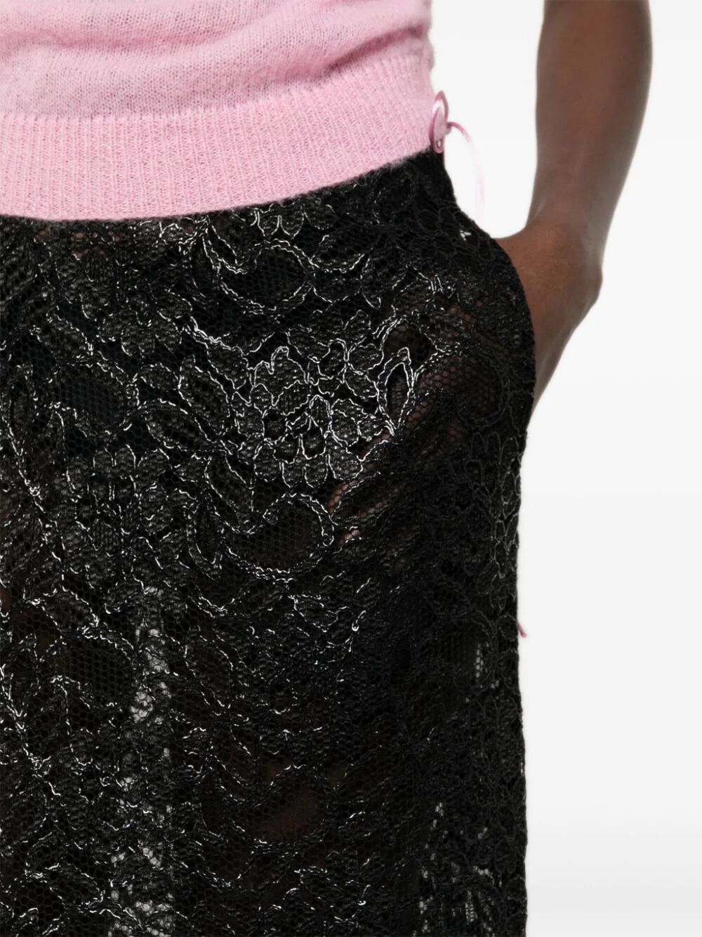Make a statement with the SCALLOPED PENCIL SKIRT. This midi black lace skirt by Simone Rocha is full of personality and will add a touch of elegance to any outfit. With its unique scalloped design, this skirt is perfect for any occasion a, don't miss out on this quirky and fun addition to your wardrobe.