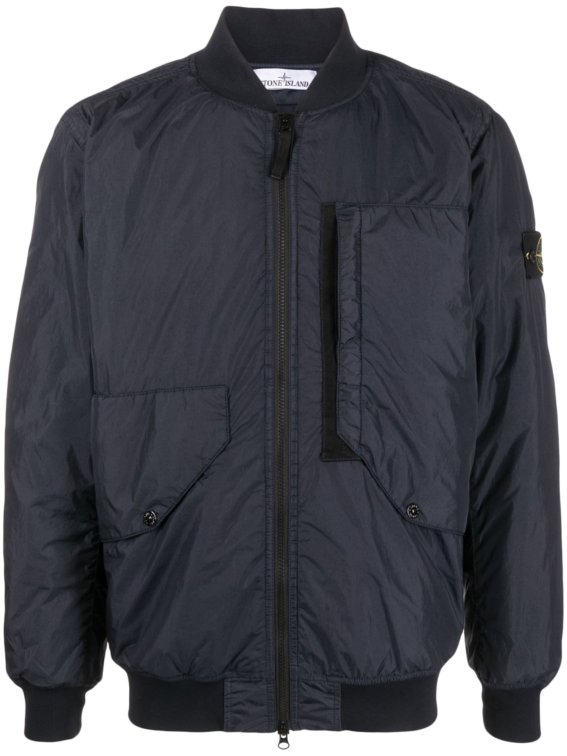 Stay on trend with this navy blue bomber jacket featuring a panelled design and Stone Island signature Compass motif. With a logo patch at the sleeve and a baseball collar, this jacket is sure to make a statement. Stay warm and stylish with the quilted lining and convenient side button-fastening pocket.