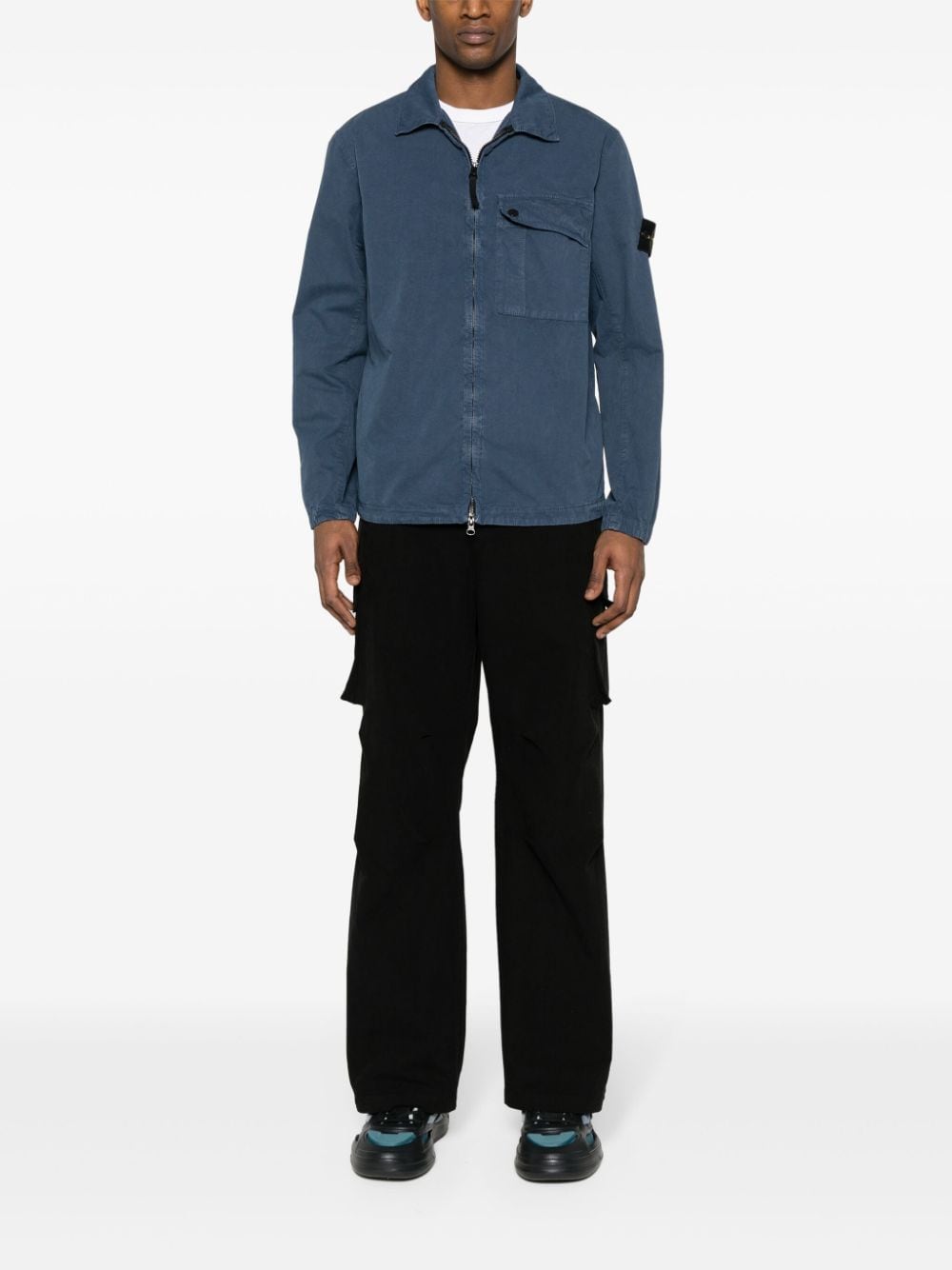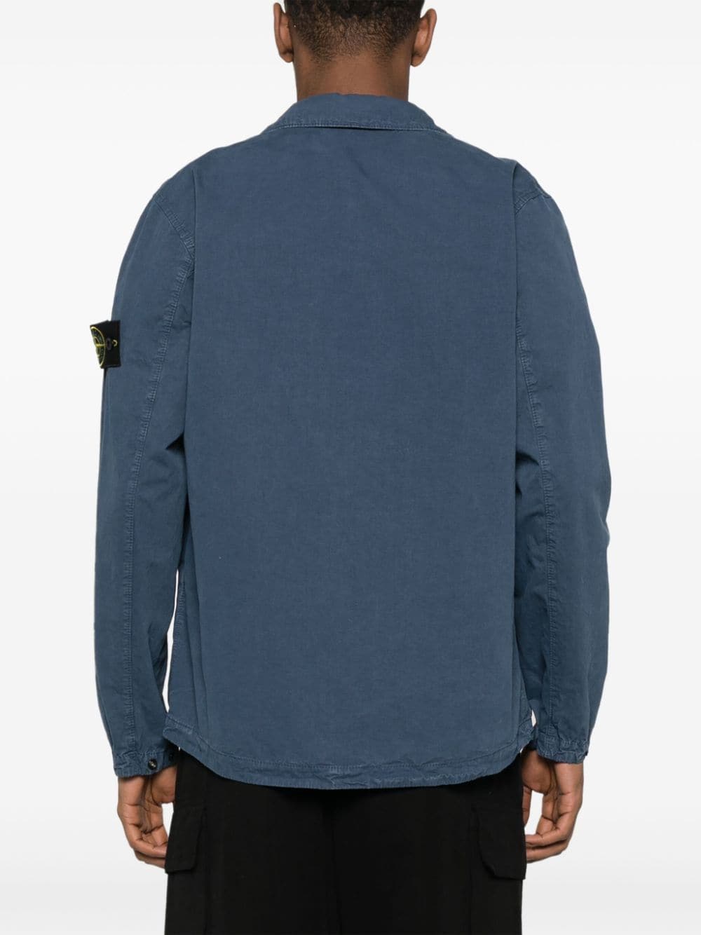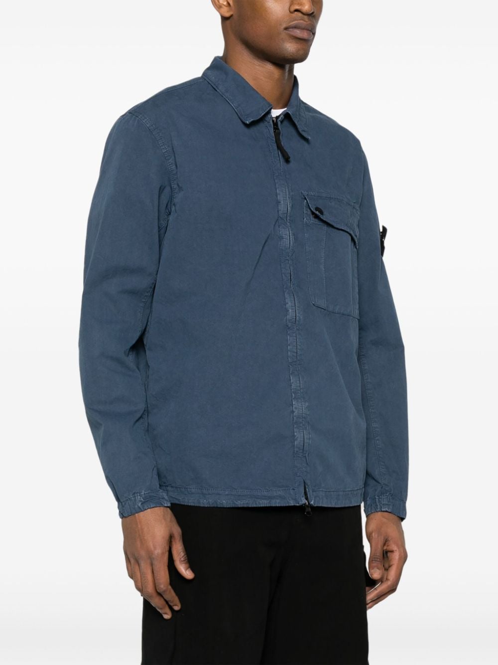 Stay cool with this blue cotton shirt jacket. Perfect for any season, its garment-dyed fabric and classic collar add a touch of sophistication. The press-stud fastening cuffs and detachable Compass badge make it versatile, while the stud-fastening chest pocket and front zip fastening add functionality. A must-have for any wardrobe.