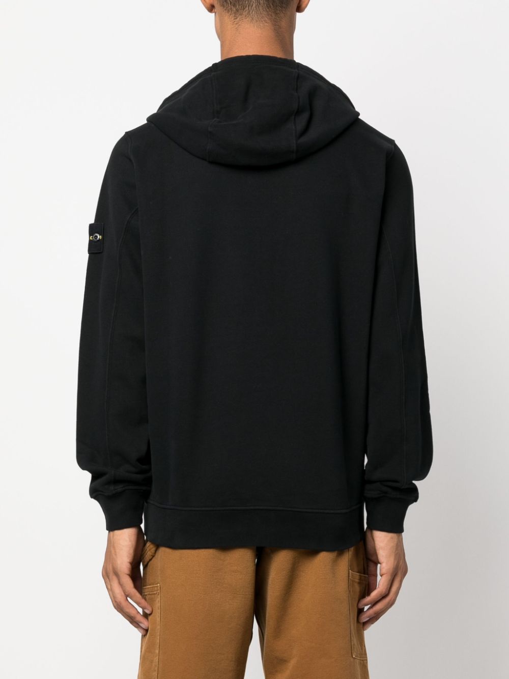 Hooded sweatshirt in brushed cotton. Zip closure on the front. Ribbed cuffs and bottom, patch pockets with oblique entry, closed by snap. Stone logo patch on the sleeve. Available in black.
