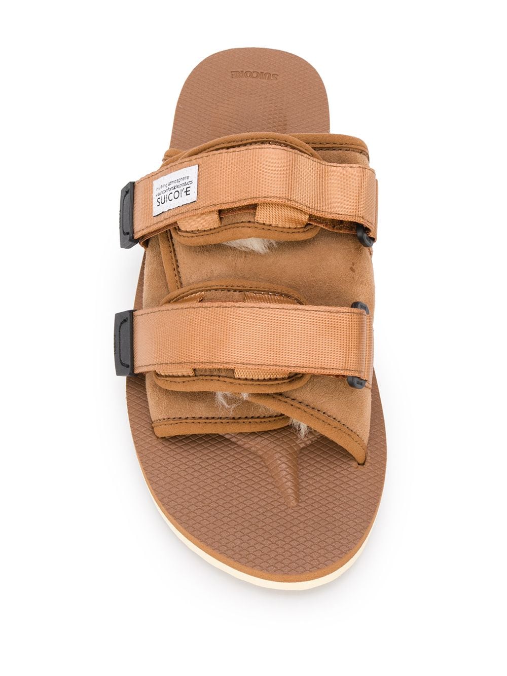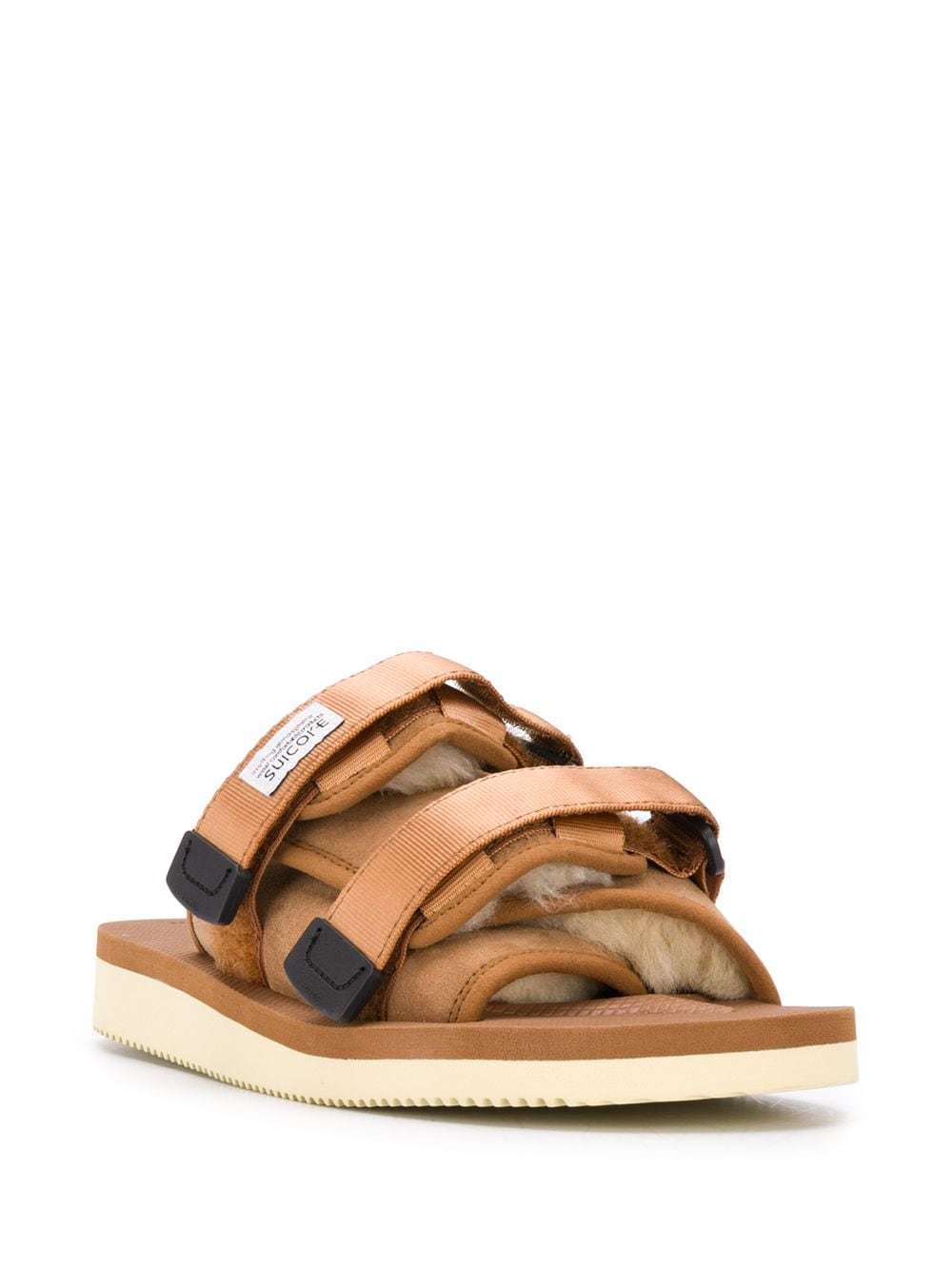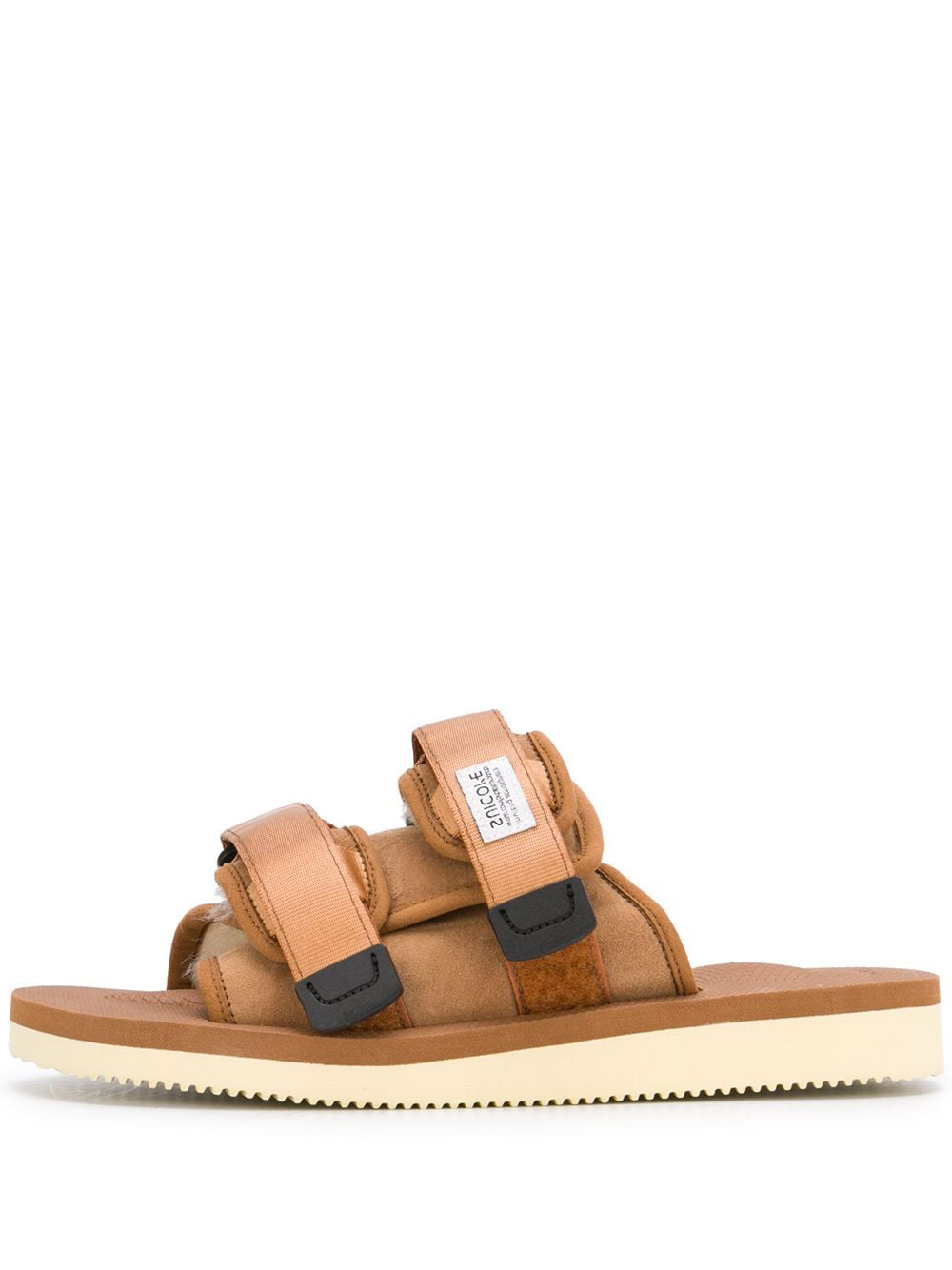 Slip into these touch-strap Moto sandals and step out in style. The open toe design allows for breathability while the shearling lining keeps your feet cozy. Made with durable calf suede and a flat rubber sole, these sandals are perfect for everyday wear. Upgrade your sandal game with the Moto-Mab. Available in camel brown color.