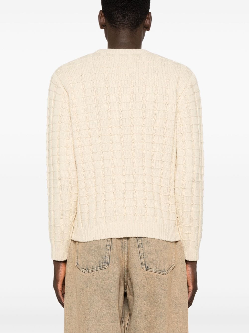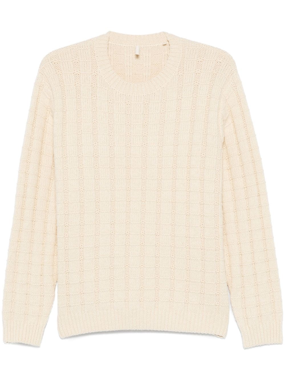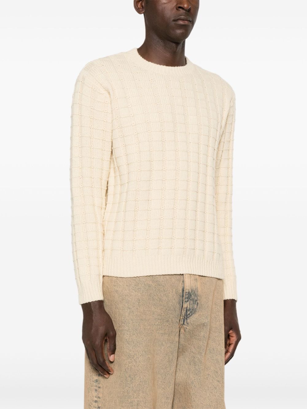 Get cozy and stylish with our ANGLE SWEATER. Made from a soft cotton-wool blend, this light beige sweater features a classic crew neck and a trendy drop shoulder design. The ribbed trim adds texture to the snuggly knitted construction, while the check pattern adds a touch of unique charm. With long sleeves and a straight hem, this sweater is perfect for any occasion.