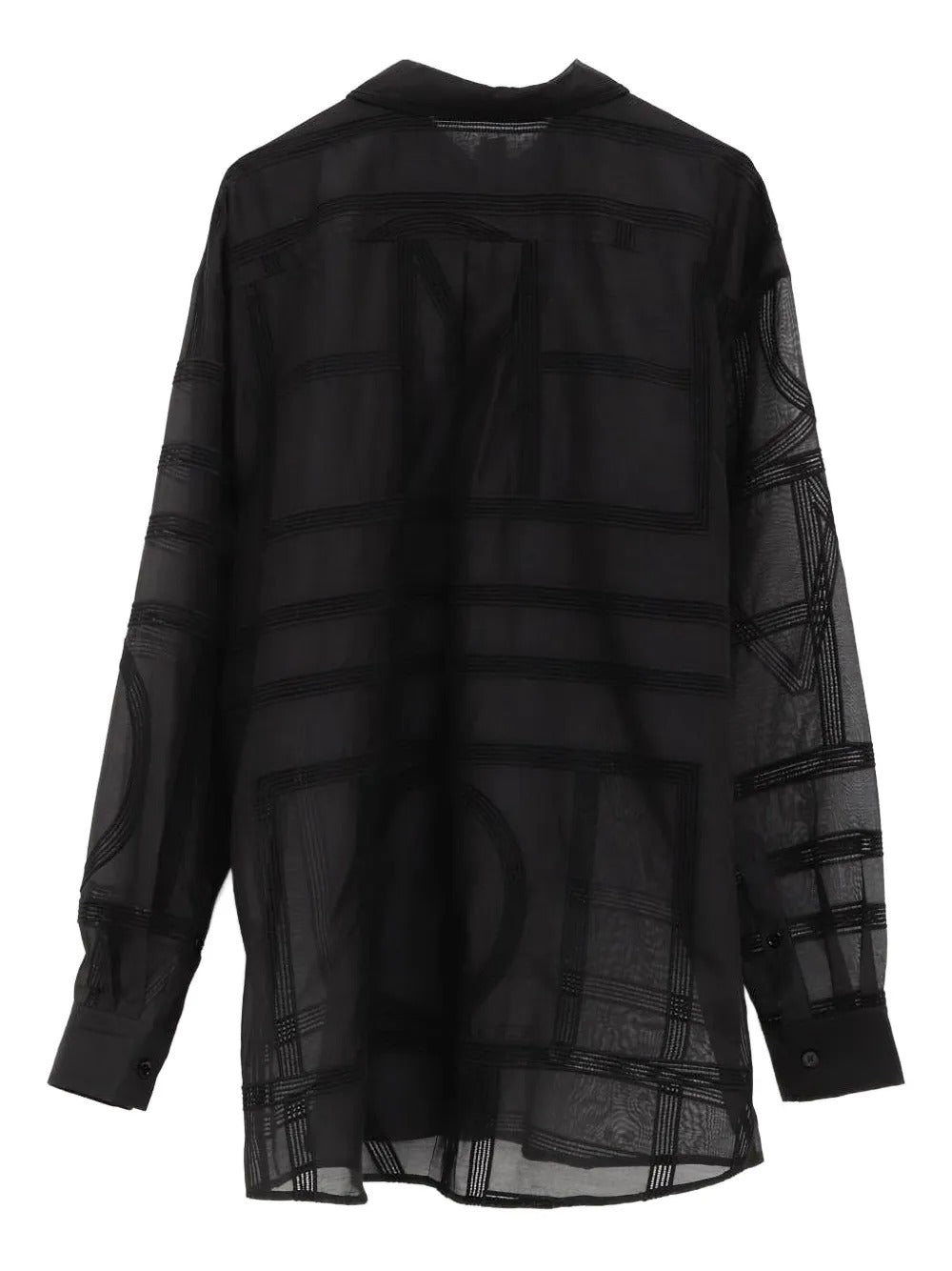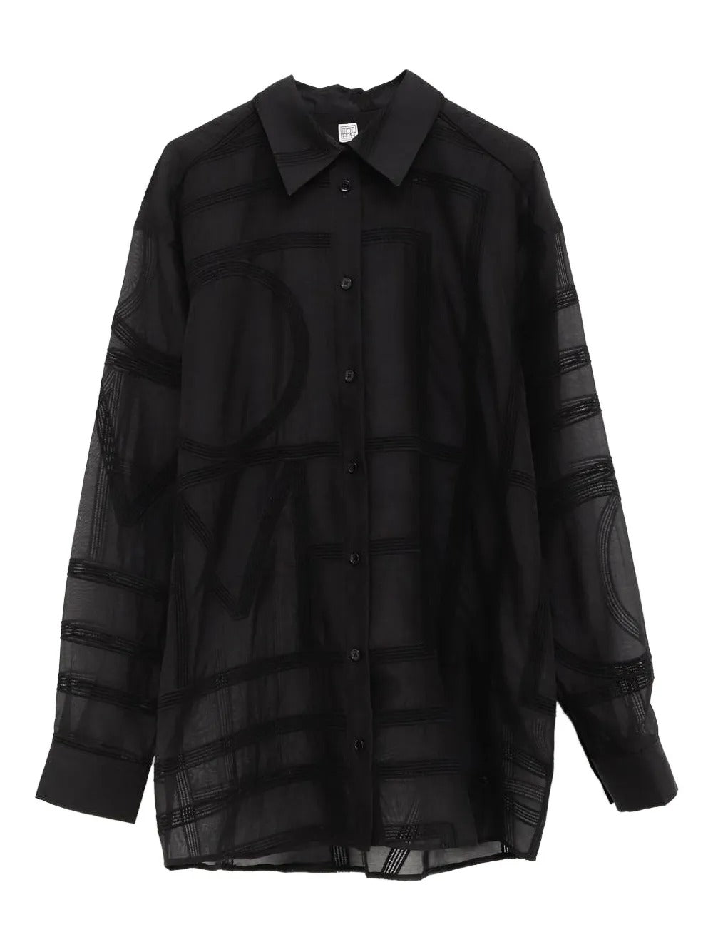 This black geometric-embroidered shirt features a semi-sheer fabric, front button fastening, and long sleeves with buttoned cuffs for a refined yet playful look.