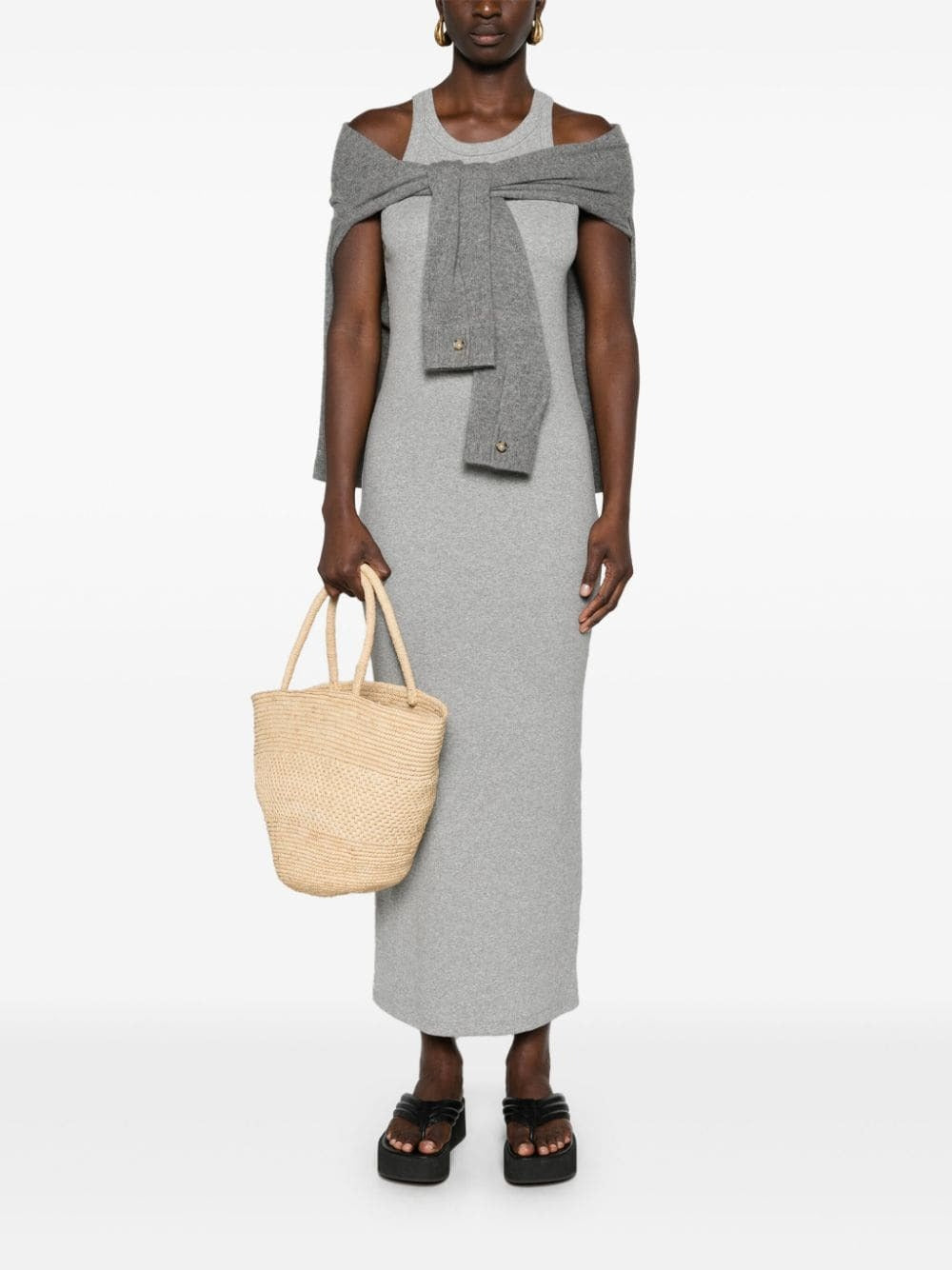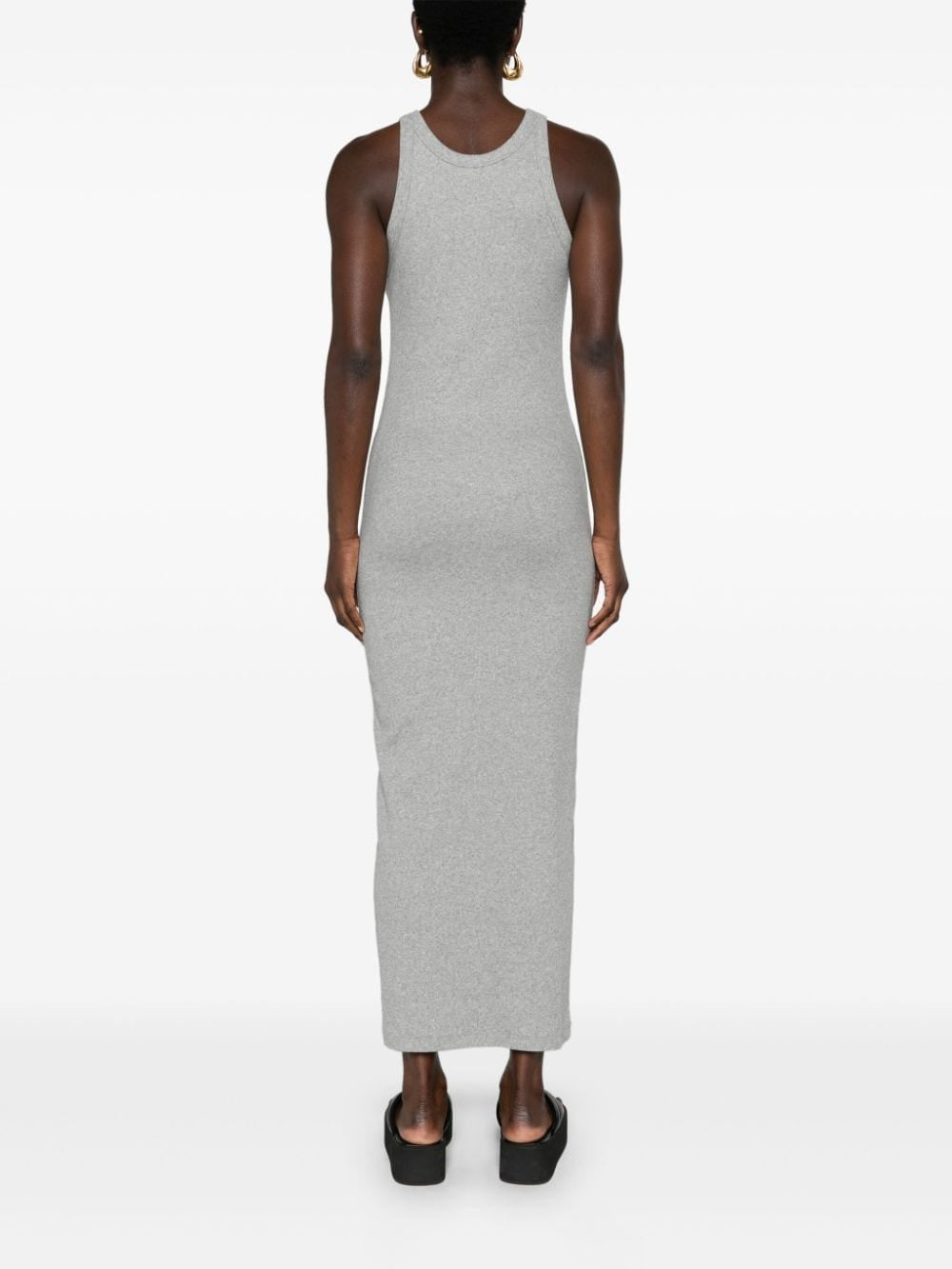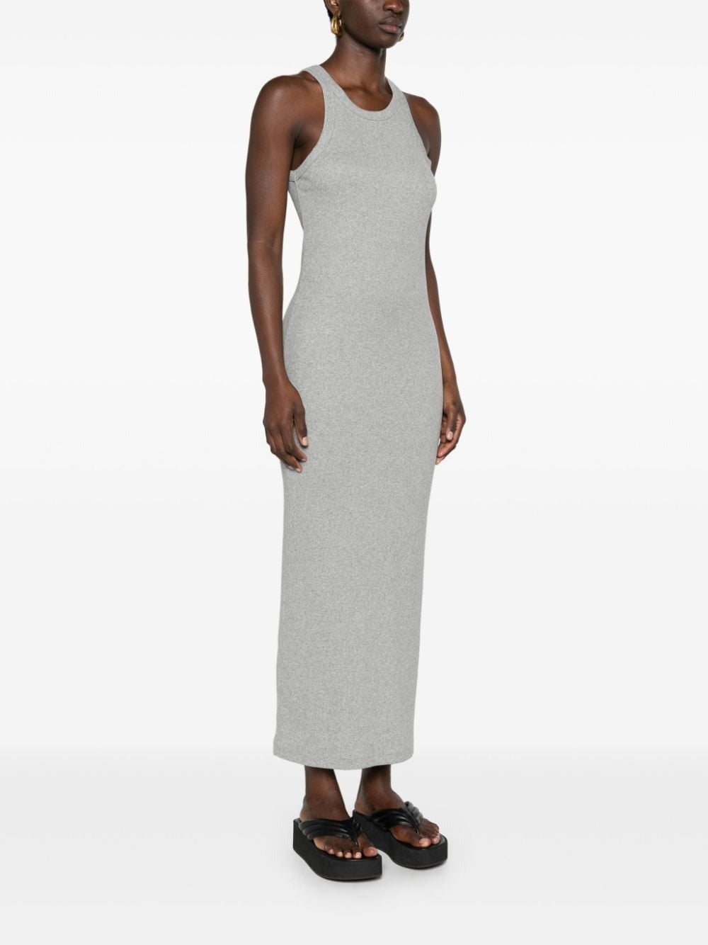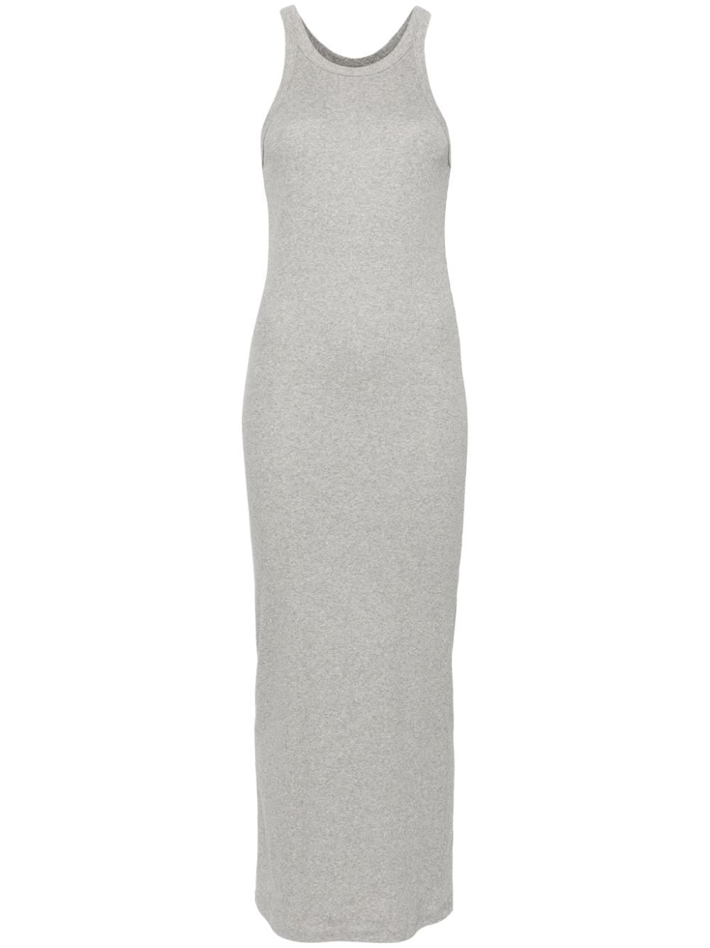 This dress is just what you need for effortless style. In heather grey, the fine ribbed material is comfortable and stretchy, while the racerback and column silhouette add a touch of playfulness. Made with organic cotton, this long length dress is perfect for any occasion.