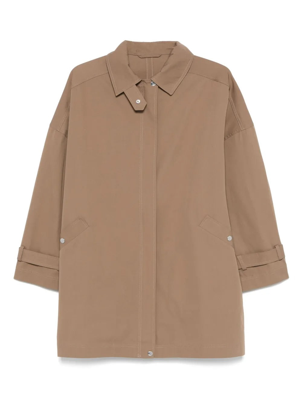 This hazel brown oversized trench coat features a classic collar, concealed front zip, belted cuffs, and side welt pockets for a polished yet relaxed look.