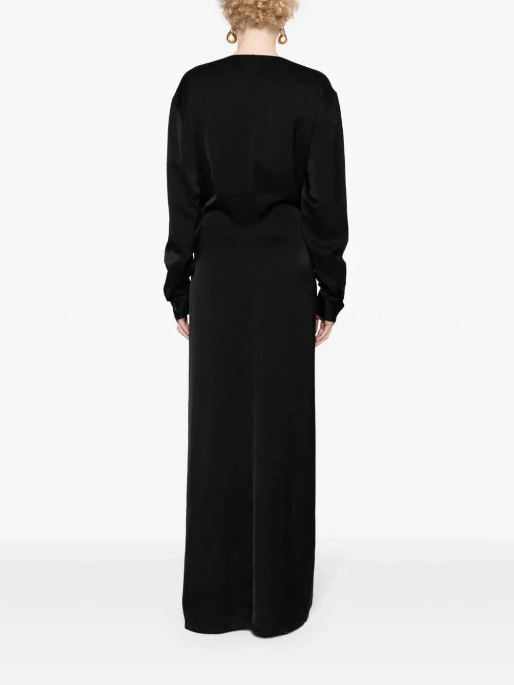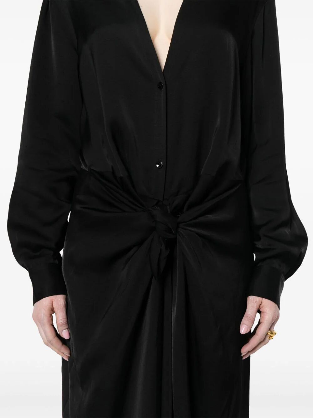 Effortlessly chic and playful, the SATIN KNOT DRESS by TOTEME is a black chemisier dress with a v-neckline, long sleeves, and button details. Its loose, flowing skirt adds a touch of elegance to any occasion.