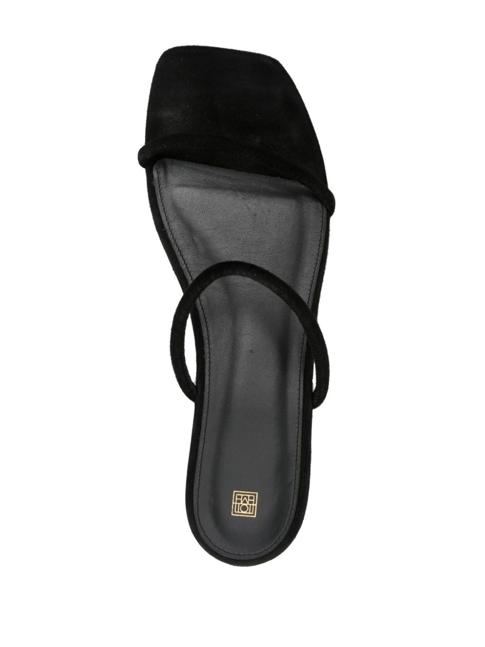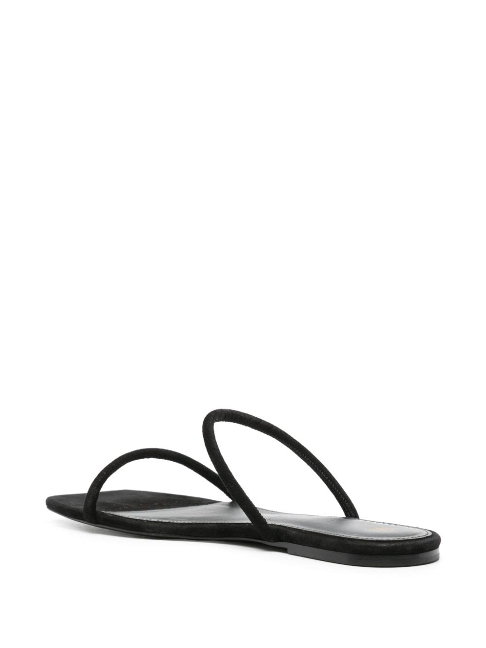 The Minimalist Slide: Black suede, double straps, slip-on style, square open toe, branded footbed, low stacked heel. Step up your style game with these slides: effortless and chic, perfect for any occasion.