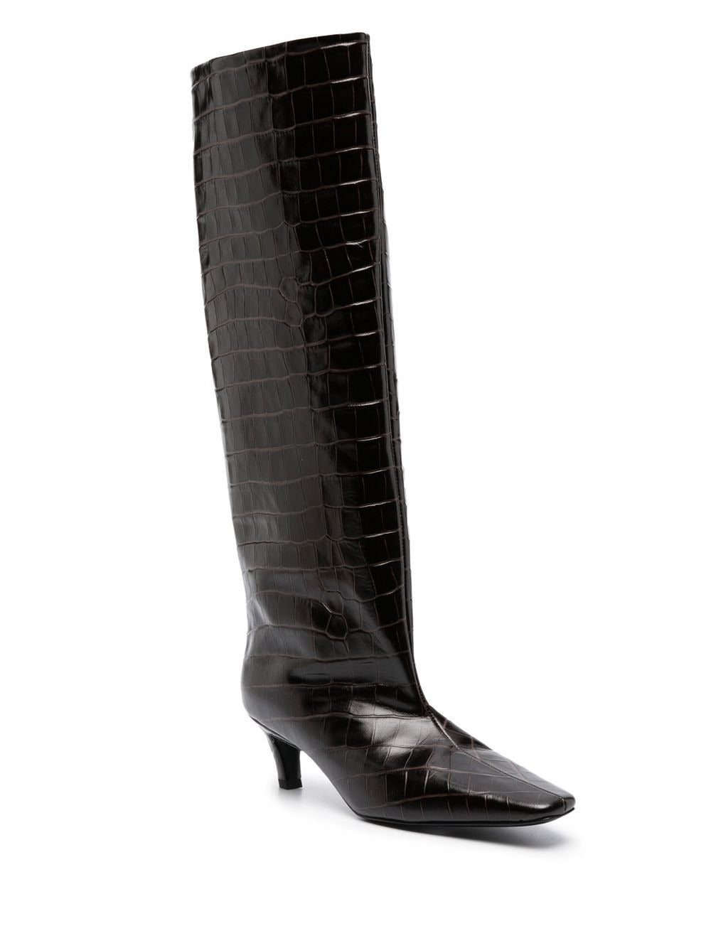 These Wide Shaft Boots are perfect for the fashion-forward individual. With dark brown croco detailing and a sleek leather lining, these boots are sure to make a statement. Step out in style and comfort with the Wide Shaft Boots.