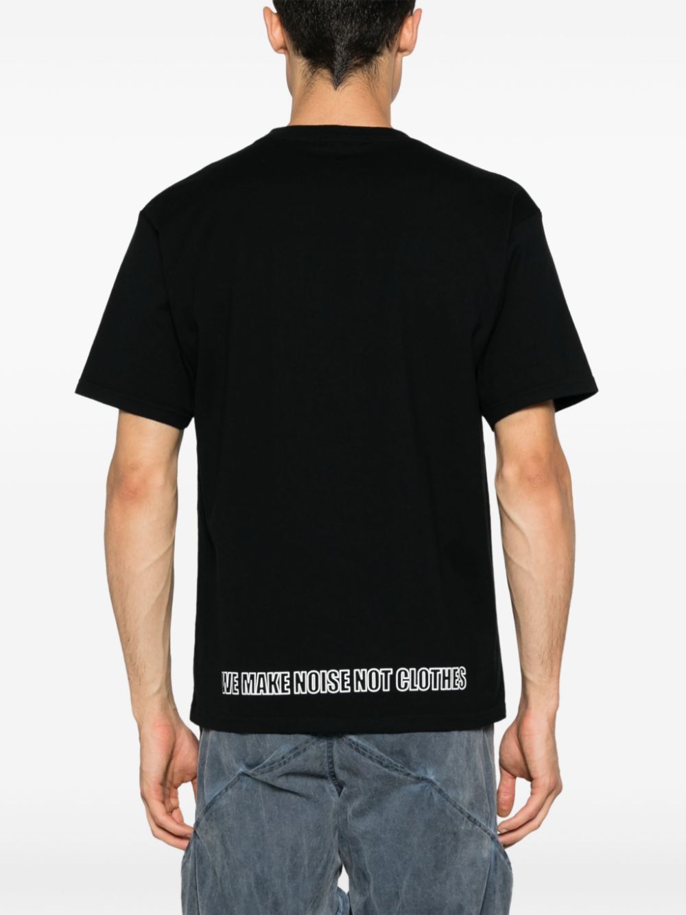 Add some personality to your wardrobe with this black cotton T-shirt featuring a playful logo print on the chest and a humorous slogan print on the back. The lightweight jersey material makes it perfect for everyday wear, while the classic crew neck and straight hem add a timeless touch.