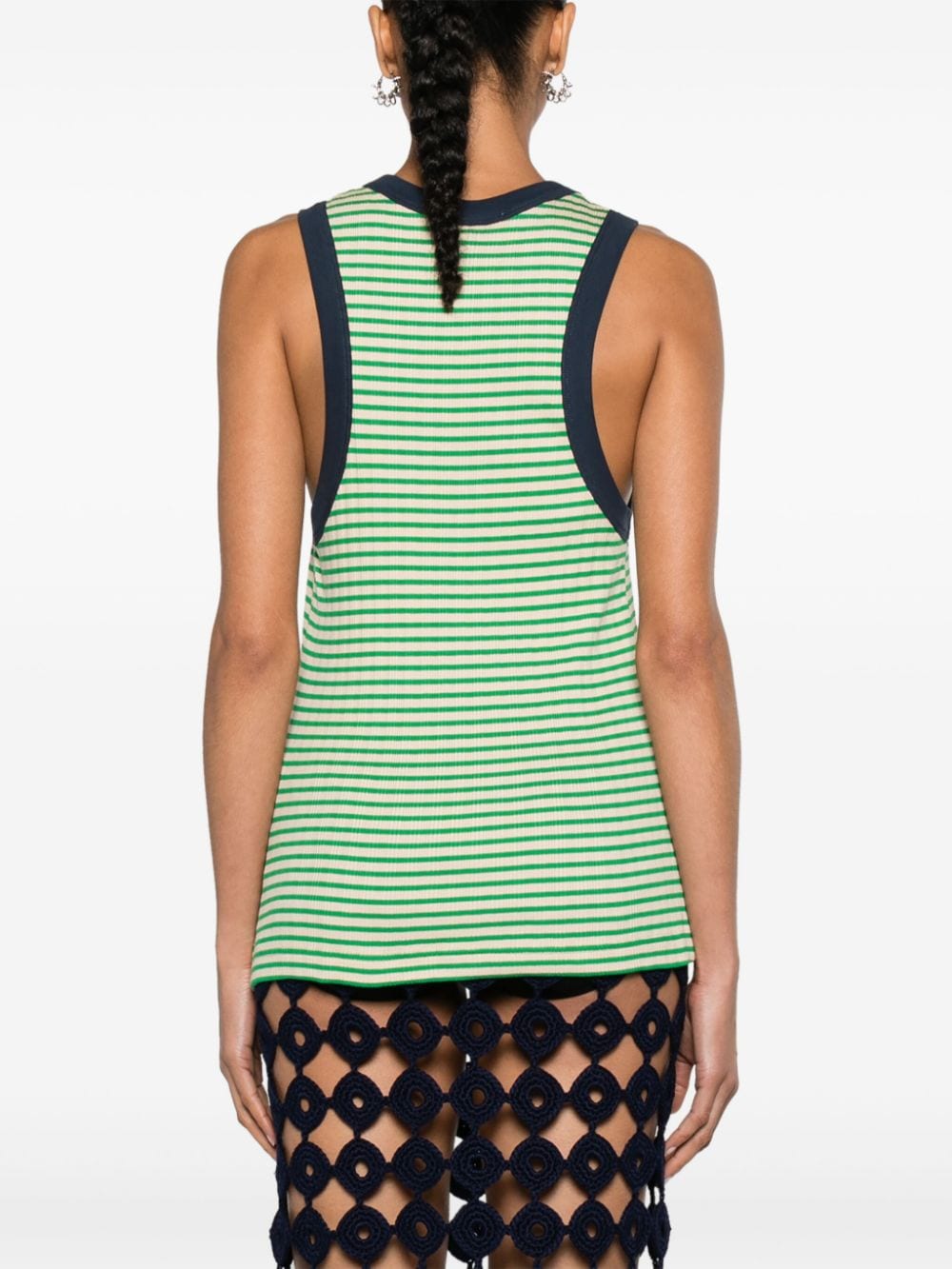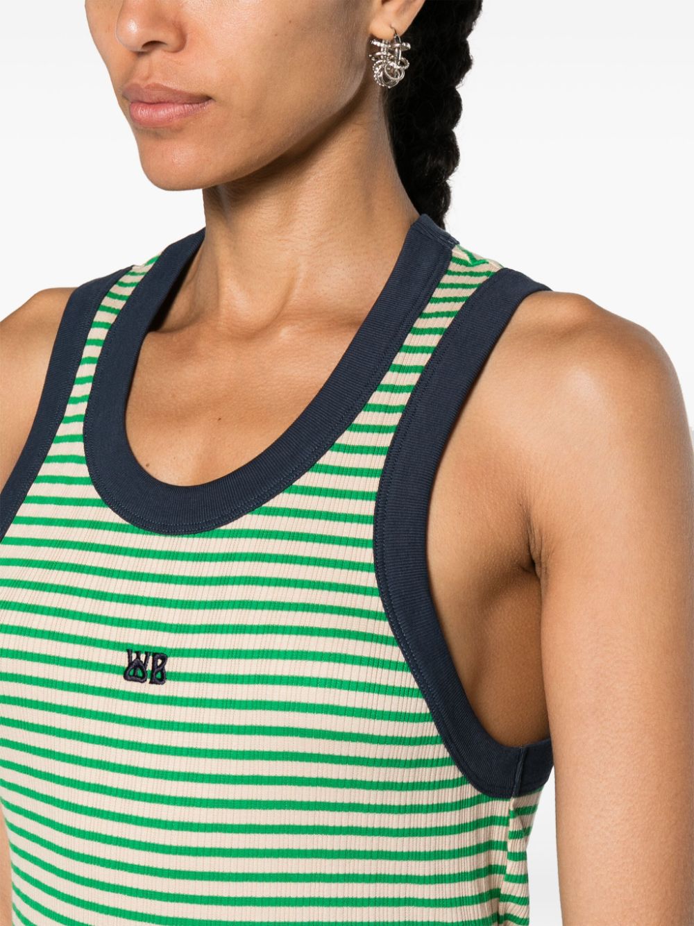 Get a retro, laid-back look with the SONIC STRIPED VEST from Wales Bonner. This tank top features a playful green stripe pattern, complemented by a bold embroidered logo at the chest and a contrasting navy trim. Perfect for adding a pop of color to any outfit, this vest is a must-have.