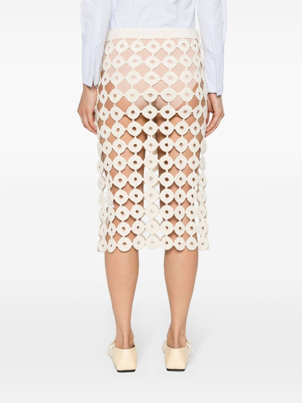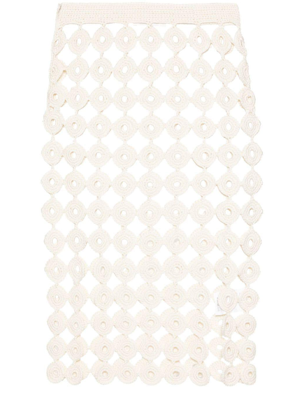 Add a playful touch to your outfit with our STANZA KNIT SKIRT. Made with a soft and breathable cotton material, this ivory white skirt features a delicate crochet knit design and a scallop hem for a unique and stylish look. This cool skirt is a must-have for any fun and quirky wardrobe.